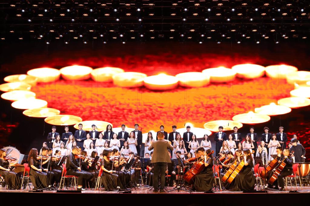 在交响合唱《今天是你的生日》的歌声中,晚会拉开序幕。一位可爱的小朋友手捧着蜡烛走上舞台,一句清唱后将手中的烛光转交给指挥,全体合唱同学点燃一片生日烛光,画面温馨而唯美。