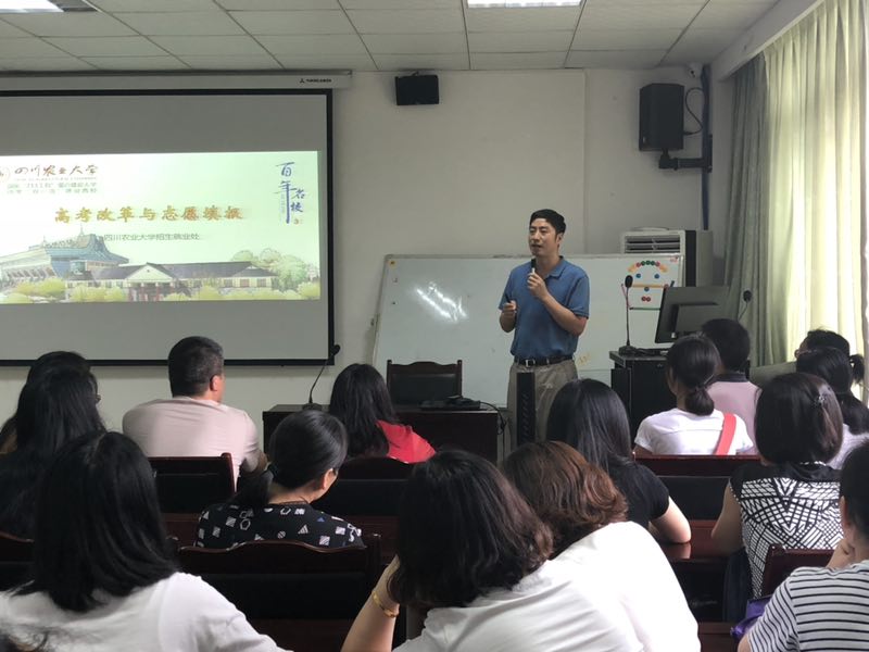 6月14日下午4:30分,学校招生就业处的杜彬处长在都江堰校区为教职工作《高考改革及志愿填报》的讲座;近150名教职工及子女参加。该讲座旨在帮助近几年参加高考的学子及家长们了解高考政策改革,帮助子女们科学高效地填报志愿。