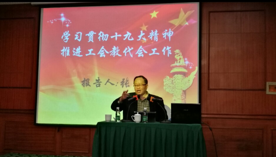 全国工会学研究会副会长、四川省工会干部学校万群定教授做了题为《学习十九大精神 推动工会工作创新发展》主题报告。他从党的十九大的主要内容和取得的重大成果出发,提出工会教代会要牢记历史使命,增强四个自信,深刻领会习近平总书记对工会的新要求,以改革为动力,深入推进工会创新发展。
