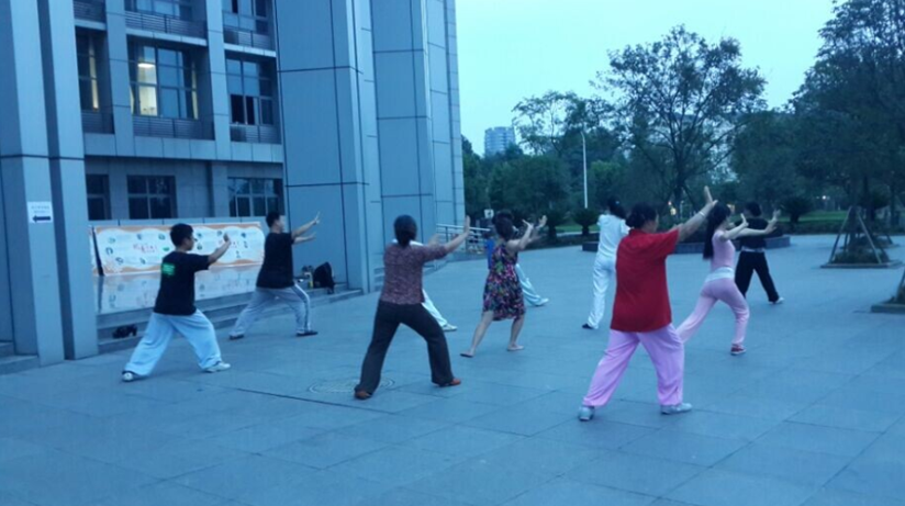 每周二、四晚饭后的时间,第一教学楼和第四教学楼之间七里花香缕缕绿枝垂挂之下,或教师电梯公寓顶层平台工会特地安装的灯光下,或学校大门与二教学楼之间的花园里……随着缓缓音乐,总有太极拳练习活动在进行。没有集合或通知,大家都不约而至。