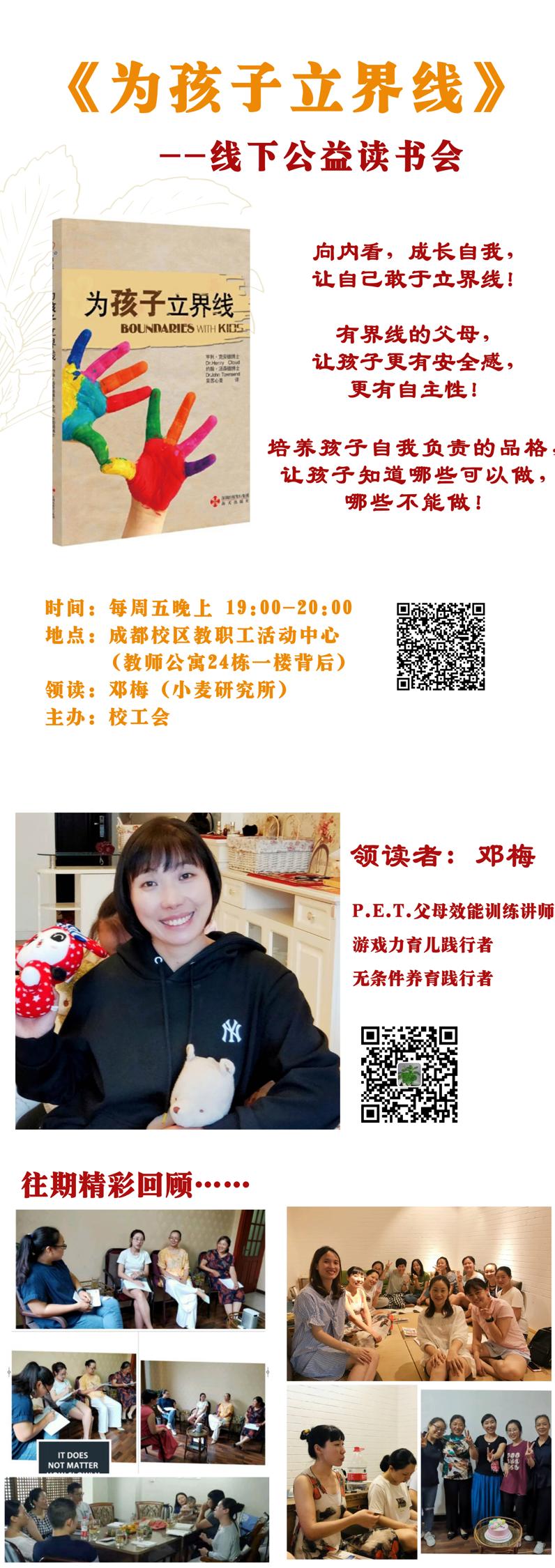10月30日晚19:00-20:30,由校工会主办的“书香川农”公益读书会在成都校区教职工活动中心举办,多位校内教师及家属参加了《为孩子立界线》一书的共读分享。