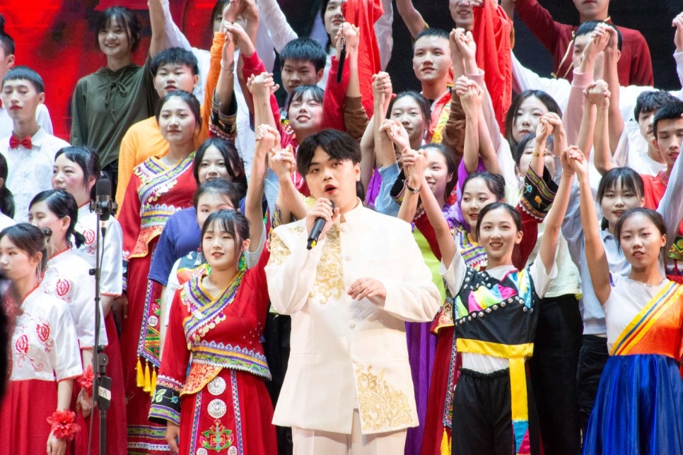 合唱曲目之外,校团委还特地组织大学艺术团为观众带来管乐、打击乐、歌舞等精彩表演,再次将现场氛围推向高潮。