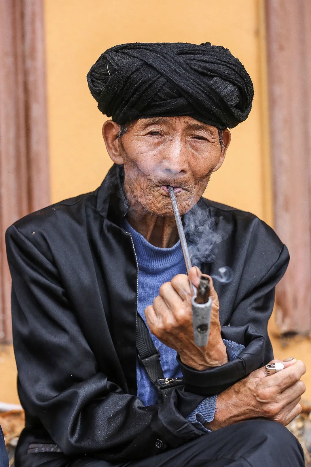 一位老人坐在门前的台阶上,淡定地抽着烟。让人联想,人的一生不就是像他的烟杆里产生的烟云吗?