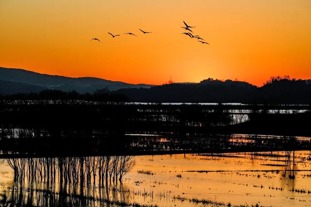 一念成水,相思成湖。鹤鸣依依掠水飞,湖光影色映晨曦。