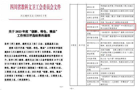 1月8日,四川省教科文卫工会发布2023年度“创新、特色、精品”工作项目评选结果。我校工会“耕读传家 崇文重教—太阳集团tyc86工会亲子耕读活动”工作项目获得三等奖。