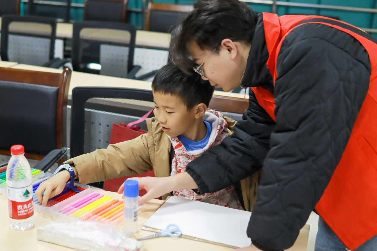 图为志愿者协助小朋友绘制环保标语