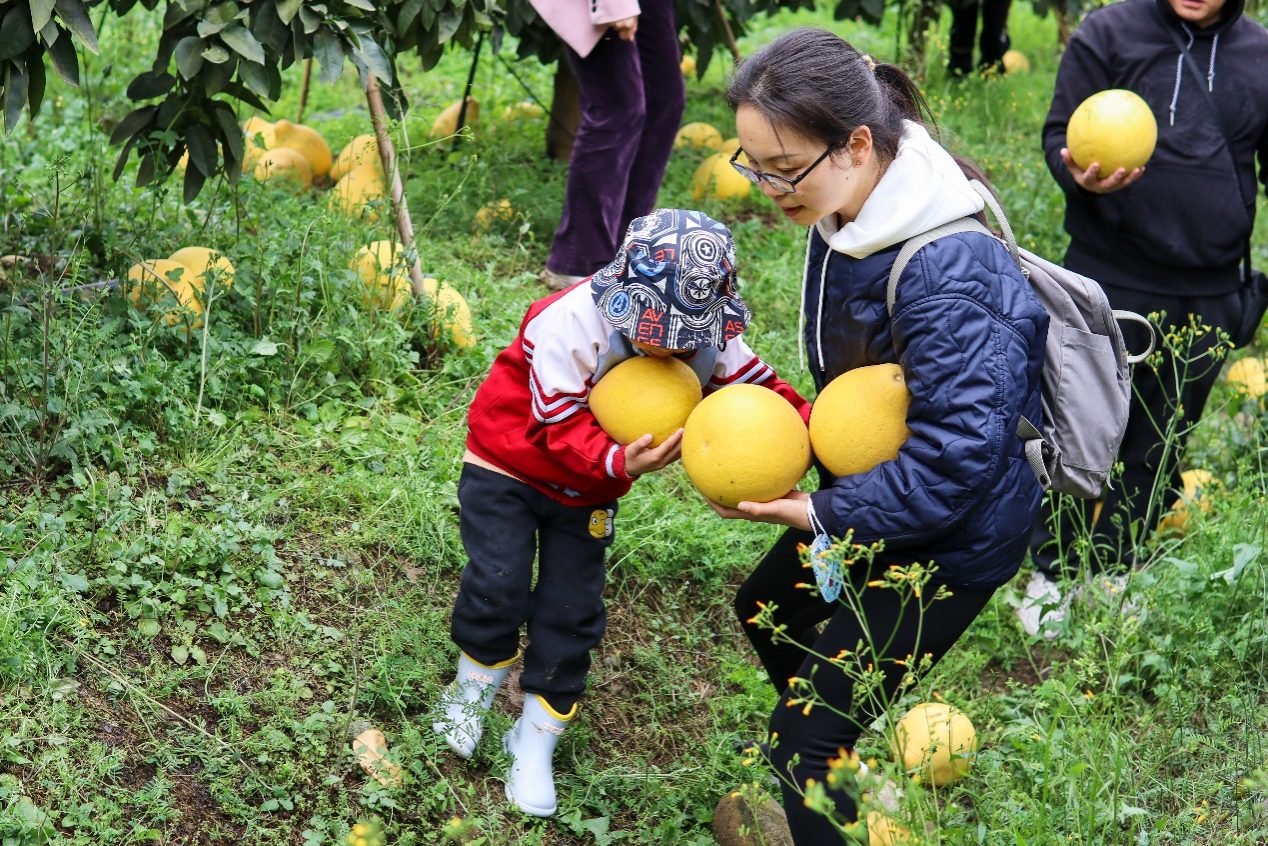 图为一组家庭参与柚子采摘环节