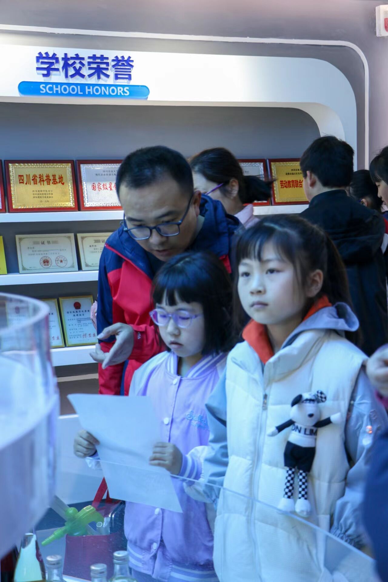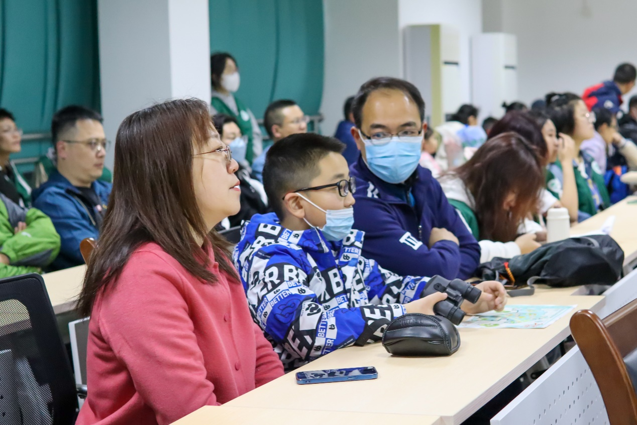 图为家长与孩子在会议室认真聆听科普知识