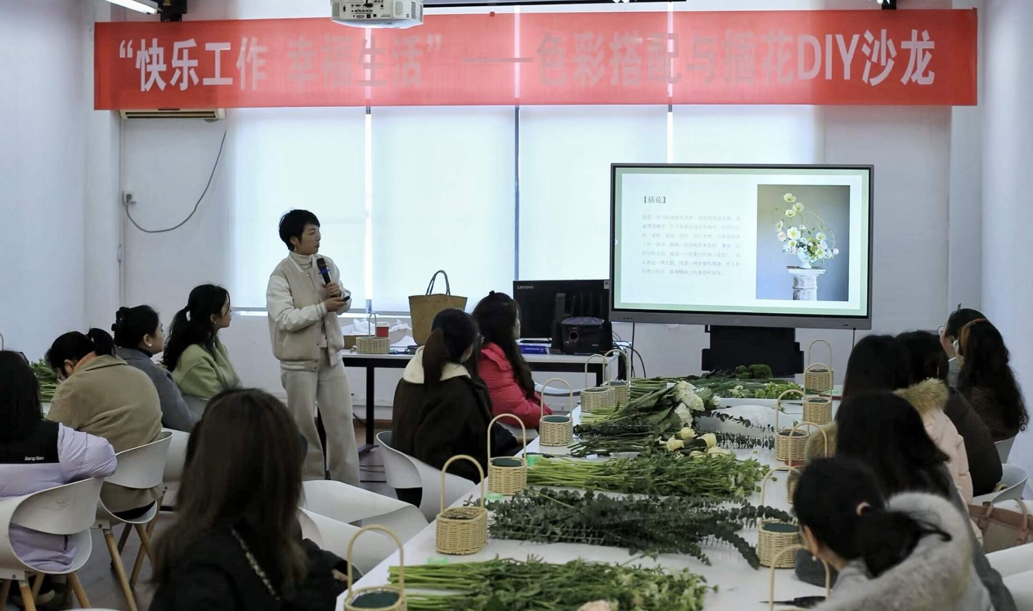 在雅安校区,30余名女教师代表参加了“色彩搭配与插花DIY活动”。活动伊始,工会专职副主席杨志钢代表校工会对女同胞在学校事业发展中做出的贡献和奉献给予肯定,并向大家并通过大家向全校女职工致以节日祝福。艺术与传媒学院院长张丽君教授以“春日,来一场与花的邂逅”为主题,从宋代四雅“点茶、焚香、插花、挂画”开始,从古至今,阐释了东方美学与西方美学的差异,为大家分享了日常生活中的艺术与美,并指导大家设计自己的花艺作品。