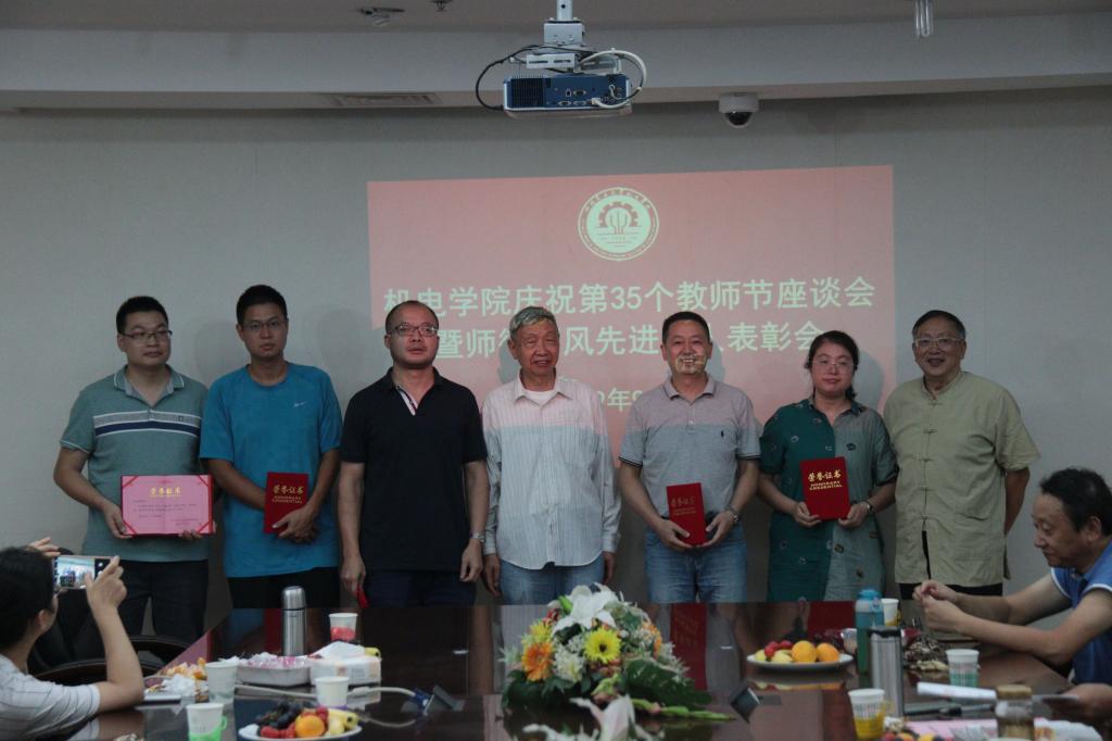 张黎骅代表学院宣读了机电学院2019年“师德师风”先进个人表彰决定,马荣朝、吴维雄、陈松柏、李逊、邹志勇、赵娟等六名教师被授予学院第一届“师德师风先进个人”荣誉称号,退休教师代表杨玉石、蒋建恒分别为他们颁发了荣誉证书,并合影留念。