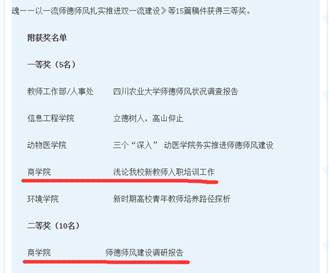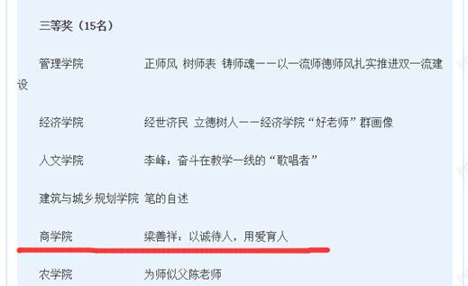 近日从学校相关部门获悉:商学院在学校师德师风建设活动中,陈楚峰老师撰写的《浅论我校新教师入职培训工作》论文获得一等奖,学院党委办公室集体撰写的《师德师风调研报告》获得二等奖,由周林、郑清玉、韦金陆师生共同撰写的《梁善祥:以诚待人,用爱育人》师德故事获得三等奖。