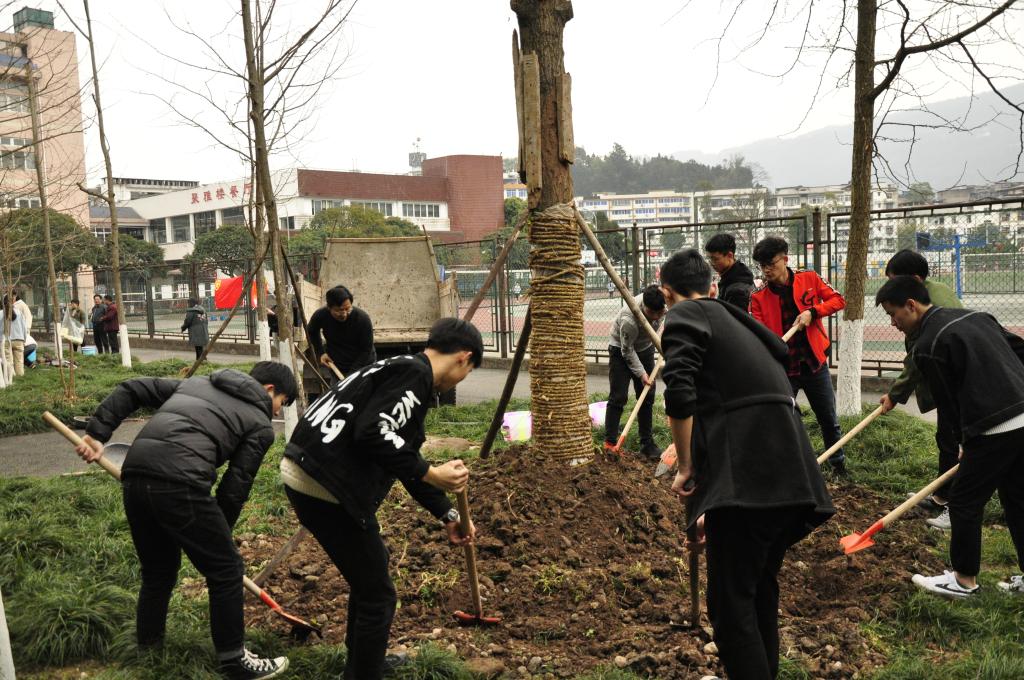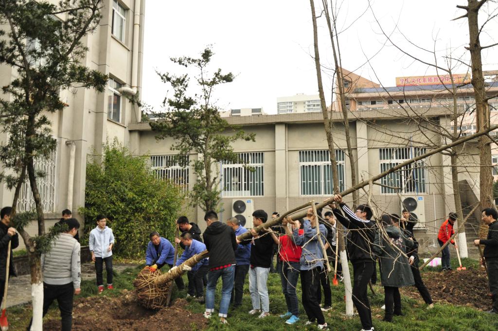 植树活动现场,同学们首先学习了植树节相关的知识,也对今天要栽植的银杏树有了初步的认识和了解。在绿化部师傅的指导下,同学们个个热情高涨,积极参与。大家通过分组互相帮助,互相协作,挖土、运树、扶树、封土、浇水,每个程序都有条不紊地进行着。通过大家的辛勤劳动,一株株银杏树住上了“新家”。