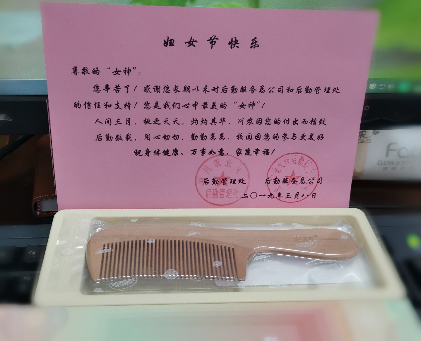 “人间三月,桃之夭夭,灼灼其华,川农因您的付出而精致;后勤数载,用心切切,勤勤恳恳,校园因您的参与更美好。”朴实无华的祝福语,献给后勤一线的每一位员工,你们是无名的英雄。你们用夜以继日的工作,换来校园舒适美好的工作学习环境;你们用和煦春风般的笑容,给同学们带去家一般的温暖;你们早出晚归用心烹制的三餐菜肴,温暖着全校师生的每一季春秋冬夏。后勤工作的点点滴滴,离不开大家共同的辛勤付出。你或许是后勤女职工的一员,用勤劳的双手描绘着后勤的工作蓝图;你或许是后勤职工的家属,用舍小家顾大家的无私情怀,默默地支持和理解后勤的工作。在第109个“三.八”国际妇女节来临之际,后勤管理处和后勤服务总公司为广大后勤女职工送上了别样的礼品。一把精致的木梳、一张精心制作的祝福卡片,满载着温暖而“梳”心的祝福。