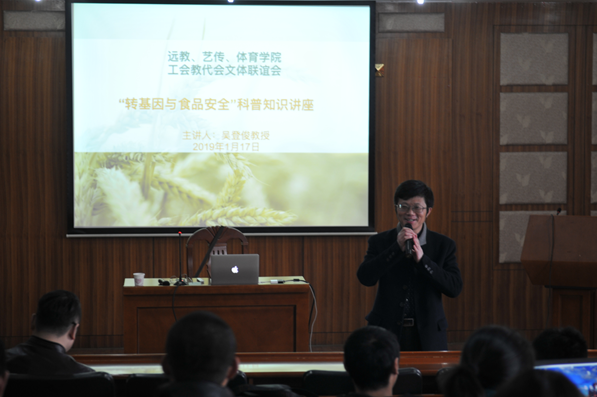 1月17日下午在逸夫楼第二学术报告厅,远程与继续教育学院、艺术与传媒学院和体育学院组织开展工会联谊活动,邀请我校动物遗传育种与繁殖专家、长期从事遗传基因研究工作的吴登俊教授主讲“转基因与食品安全”科普讲座。远程与继续教育学院党总支书记马恒东、副书记兼工会主席舒敏、艺术与传媒学院党总支副书记胡永波等三学院教职工共50余人参加。舒敏作开场主持,介绍了本次活动的背景、目的和吴教授的工作简历、学术造诣。