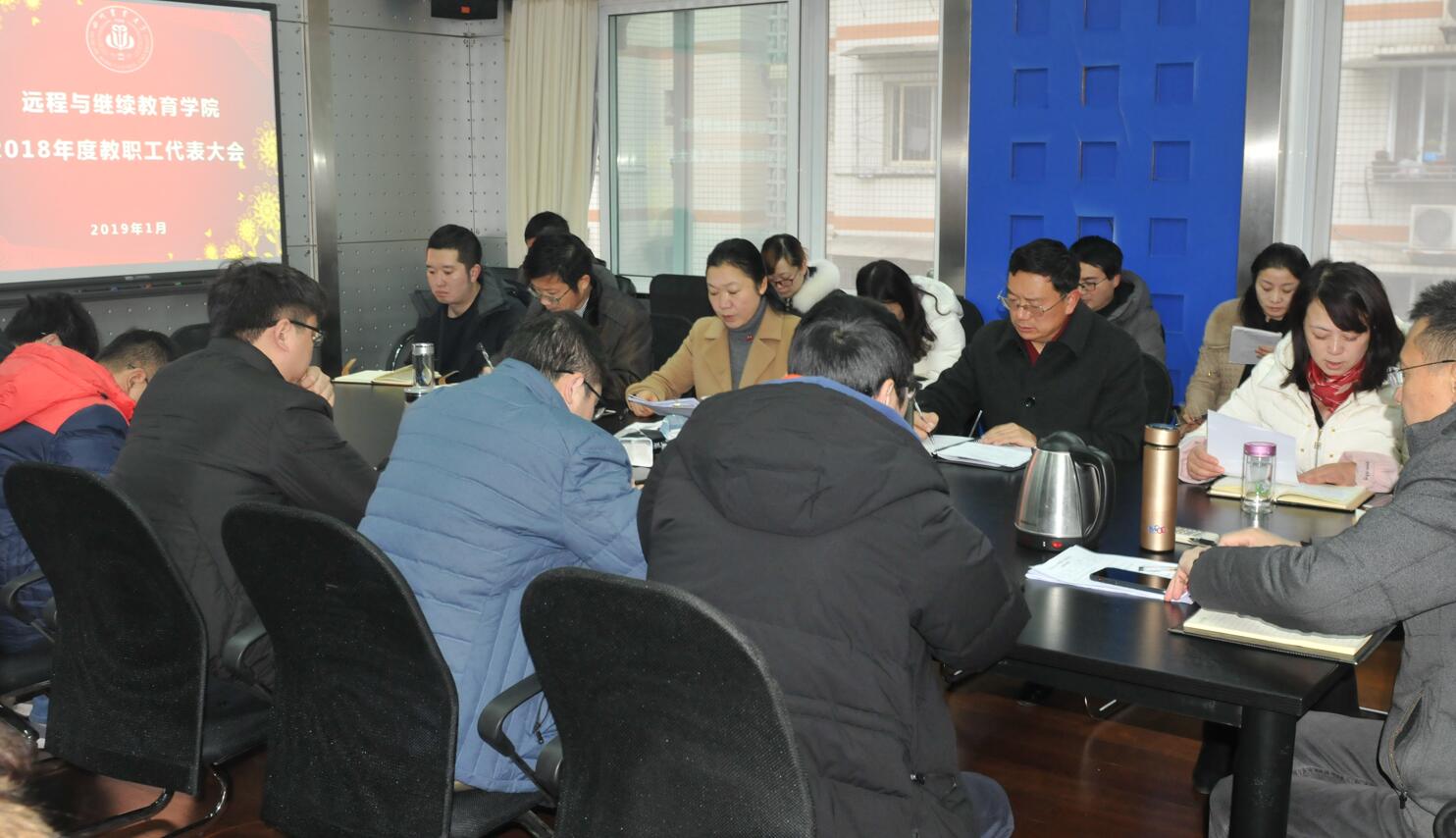 1月9日,远程与继续教育学院教职工大会在学院会议室举行,院领导黄晓俐、马恒东、舒敏、陈东及全院教职工参加,会议由副院长陈东主持。
