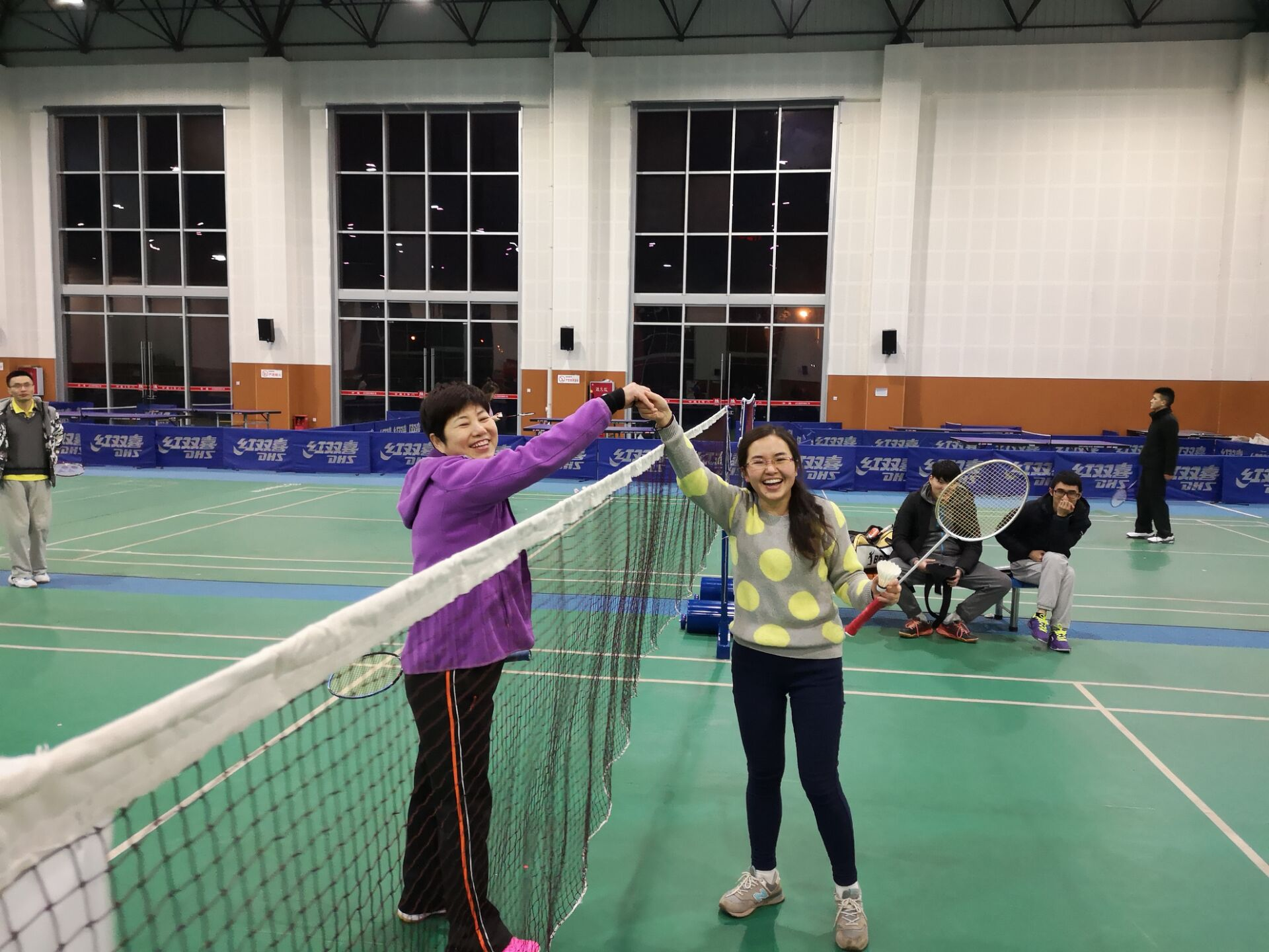 本次比赛设男单、女单、男双、女双和混双五个类型,部分研究生也参与此次活动,和教师组队进行双打。比赛采用:“三局两胜制”,每局15分。比赛开始后,场内竞争激烈,只见白色的羽毛球在空中穿梭、飞舞,各参赛选手精神抖擞,你争我夺,精湛的球技让整场比赛高潮迭起,场下喝彩不断。