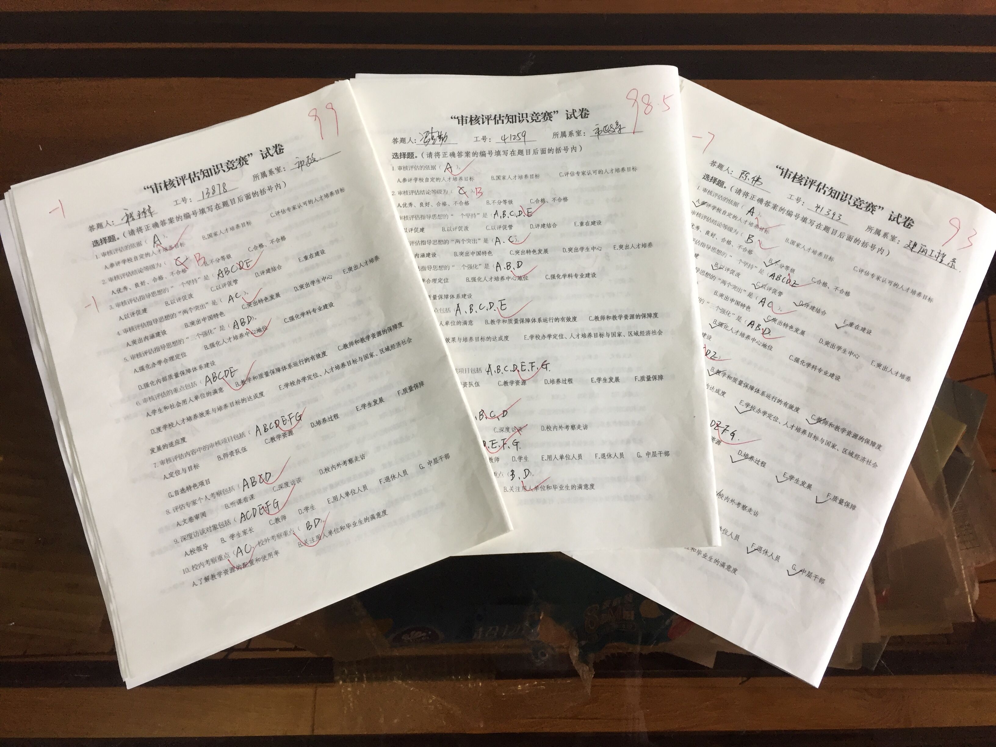 从11月上旬起,由学院学生会牵头,利用学院新媒体,在学院官微(微博、微信)上开设了评估知识竞答专栏,可以多次重复参与答题,对答题正确率在90%以上的同学采取网络自动抽奖方式给予2-50元不等的虚拟现金奖励(线下发放现金),总奖励人数达到了500人,奖励总额2000余元,占学院学生总数的1/3。11月下旬,学院部门工会、二级教代会发起倡议,以工会小组为单位组织,在全院教职工中开展“评估知识”竞赛活动。竞赛采取试卷答题方式,全院教职工悉数参加,最终根据正确率得分情况设置奖励,目前共评出一等奖4名(99分以上),二等奖6名(98-99分),三等奖13名(93-98分,其中,95分以上11人),共23名。