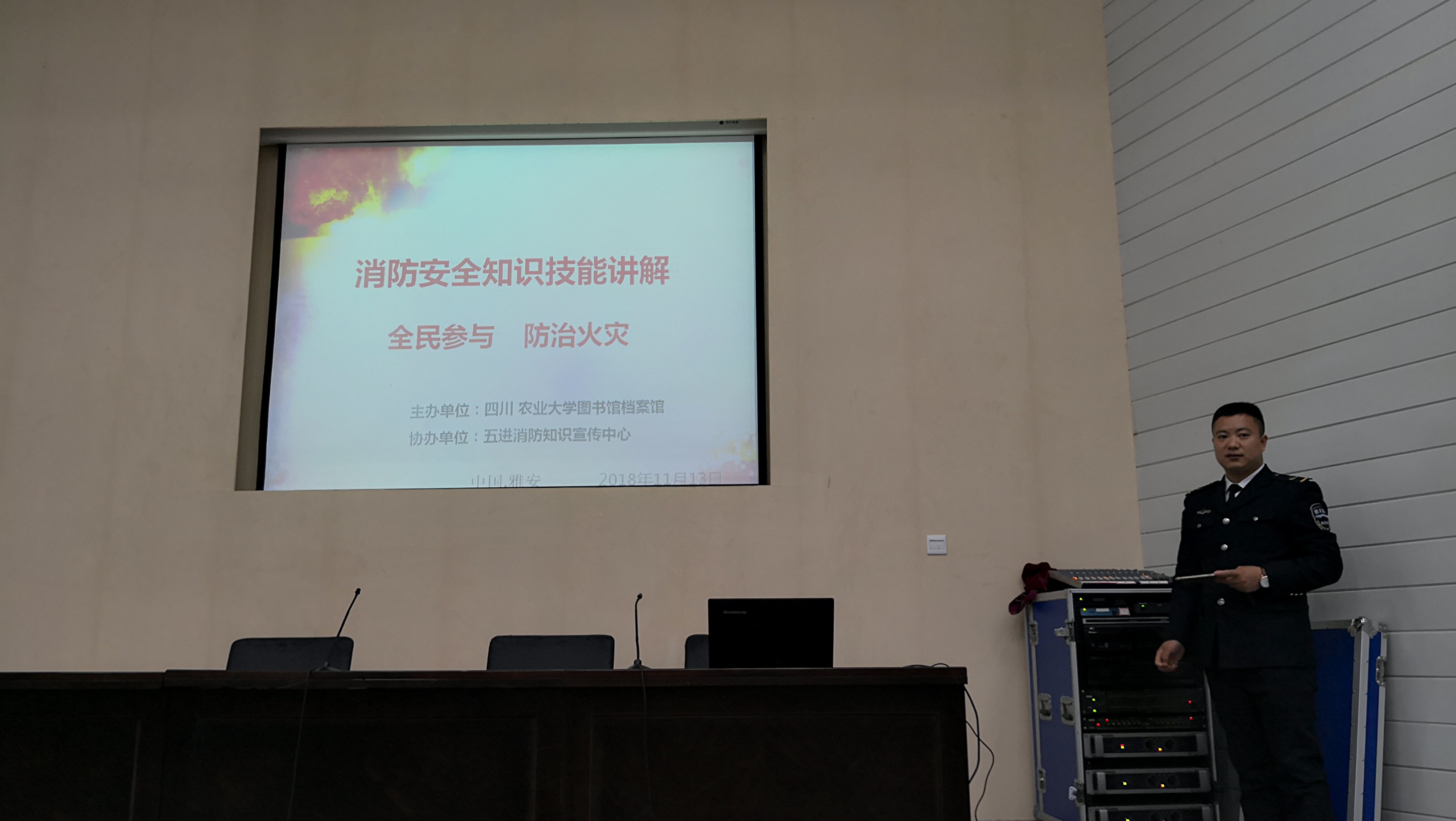 11月13日下午,图书馆档案馆部门工会邀请成都五进消防中心资深教官丁主任来我雅安校区图书馆,在图书馆报告厅为图书一馆和档案馆的全体同志做了“消防安全知识技能讲解”讲座。丁主任以大量的实例,深入浅出地讲解了消防安全,重在预防,希望我们每个人都能够从自我做起,通过人防、物防和技防,把安全隐患降到最低。