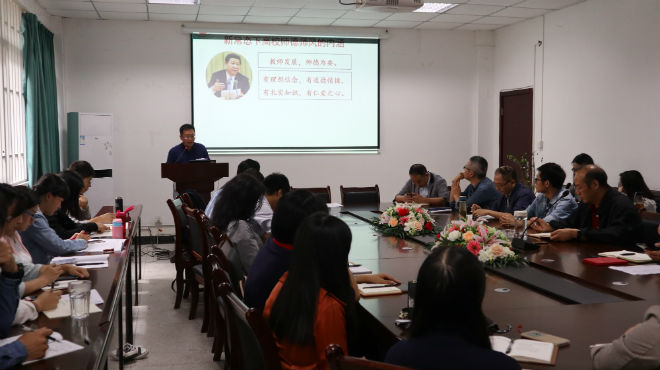 学院院长殷焕举在讲话中表示,《荀子》中记载了“天地君亲师”,由此可见教师的地位之高,所以我们要潜心领会师德与师风,将教书和育人相统一,将言传和身教相统一,用仁爱之心对待每一个学生,用人格魅力“润物细无声”地感化每一个学生,致力于提升学生的综合素质,将肩上的责任转化到行动中来,落实,落实,再落实。