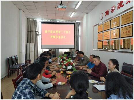 9月10日下午四点,在第三十四个教师节来临之际,商学院部门工会举行了庆祝教师节座谈会,商学院院长吴秀敏、党委副书记、部门工会主席赵中国、各系部老师代表20余人出席了本次座谈会,赵中国主持会议。