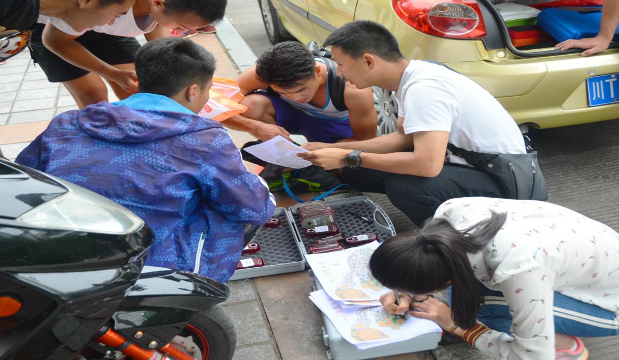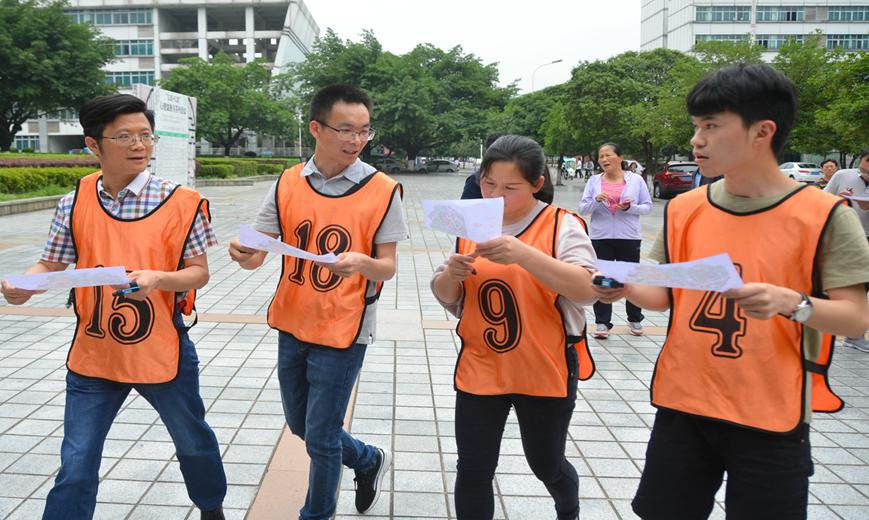 本次定向越野赛吸引了三个学院近30名教职工参加,随着裁判员翟亮一声令下,随机组成的7支队伍,拿着地图带着指卡冲向自己寻找的30多个目标点:小山坡、大道旁、灌木丛、篮球场……。由于目标点覆盖第二教学区各个角落,非常考验队员们的体力和耐力以及定位能力。男队员们主动担起重任,寻找分布开阔、距离最远和位于山林中的目标点,把平地易寻的密集目标点分配给女队员。寻找目标点的各组途中组建微信群,通过群信息告知目标点情况,并配合队员判断目标点位置。每一次准确的找点,就是完成一次跨越,享受一次成功;每一次找点,忘记了身体的疲劳,忽略了路途的遥远,完成了难以想象的奔跑距离。整个过程是对团队力量、集体智慧、协调配合能力、个人身体素质等的全面检验,把活动主题体现得淋漓尽致。