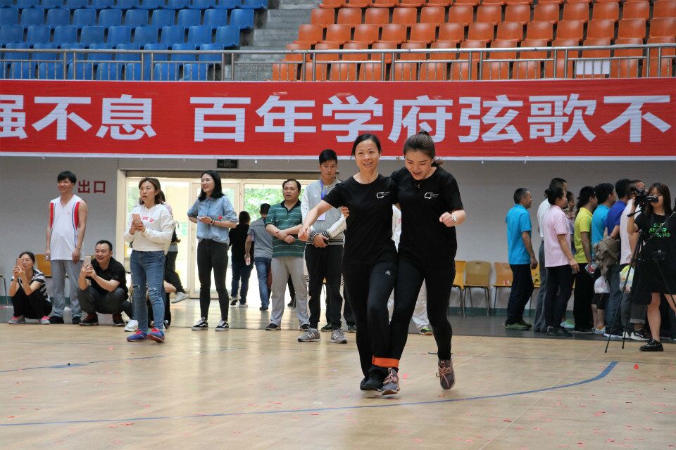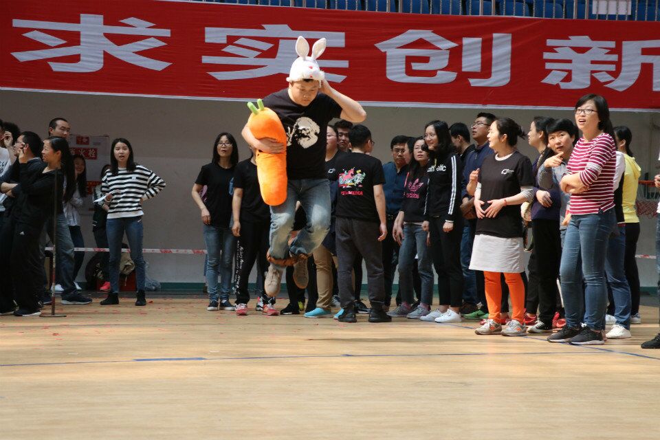 在兔子跳跑项目中,朱举老师一跃而起,活跃了开场第一跳的紧张气氛;陈坤老师利用课余间隙参加比赛,她与江霞副院长协作的2人3足接力项目,步伐敏捷,赢得阵阵掌声;侯亚男老师连续参加全部七个比赛项目,可谓运动达人,特别是在抱球迎面接力项目中的健步如飞,赢来阵阵欢呼声;罗康老师则在组织学生组运动会工作的同时,也踊跃参赛。