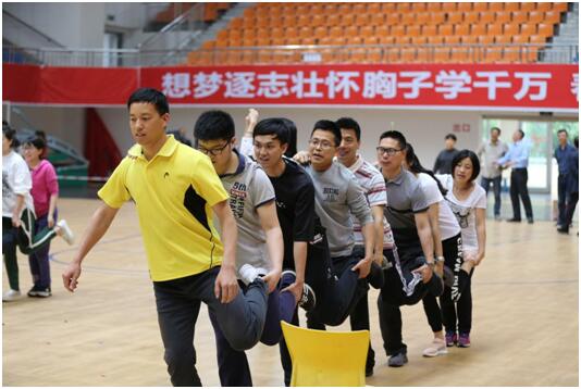 此次教职工运动会由校工会主办,分别设置兔子跳跑、滚雪球、两人三足接力赛、单脚火车赛跑、不倒森林、抱球跑接力、毛毛球竞速七个集体项目。