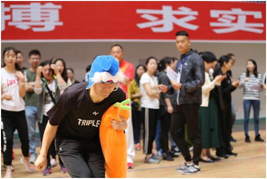 比赛中老师们齐心协力,只为赢得最后的胜利。“一二一!一二一!”单脚火车赛跑中,老师们一边单脚跳一边有序地喊口号,默契十足。在兔子跳跑中,只见戴着可爱兔子头套,紧紧抱着胡萝卜的“兔子”,在啦啦队们激动地加油声中,“萌萌滴”将萝卜交接给下一个队员。滚雪球和抱球接力赛中,老师们化身风一样的男子、女子,全力以赴向终点冲刺。