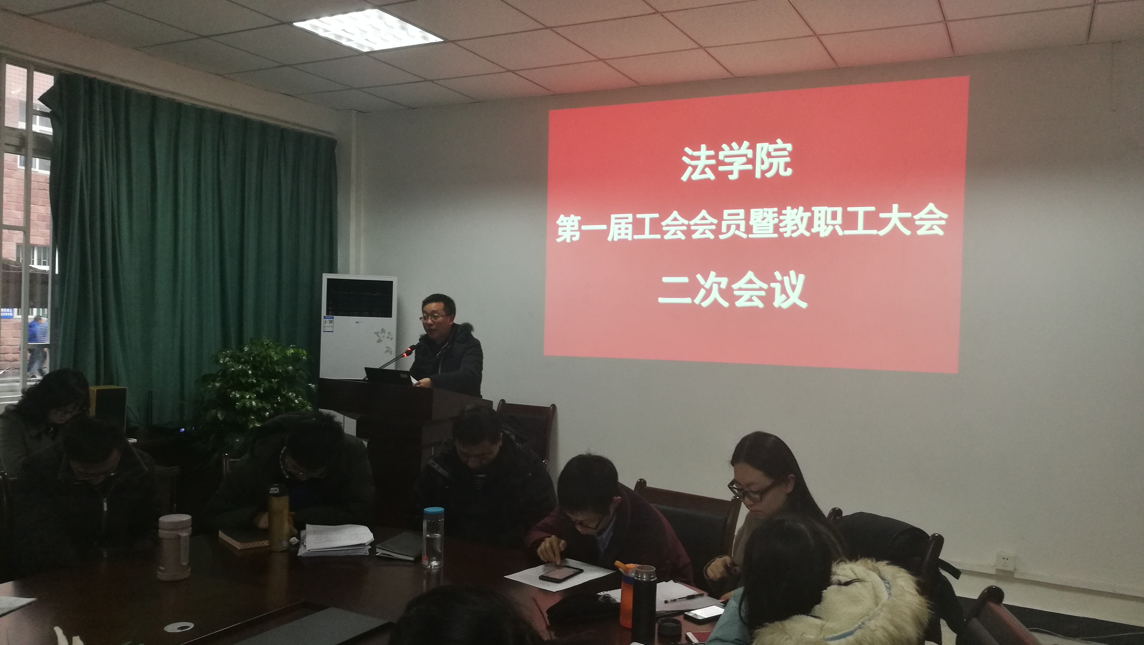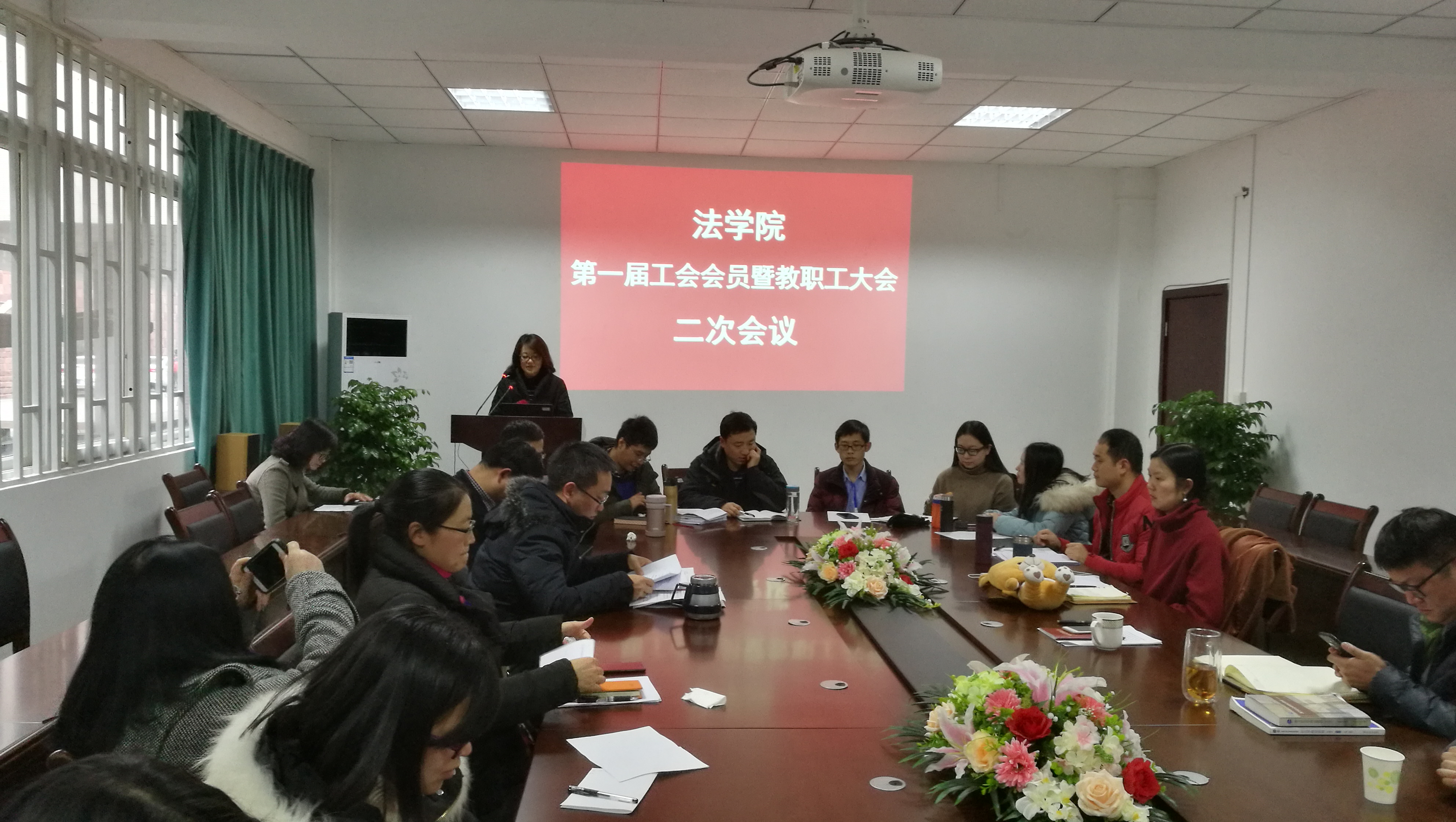 1月11日下午,法学院一届二次教代会暨工会会员大会在学院会议室召开。全院教职工参加会议。会议由学院教代会主席廖红霞主持。