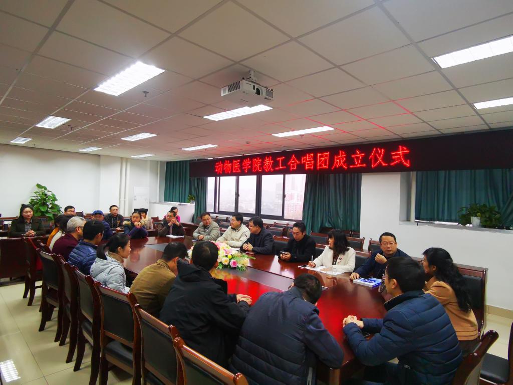 为丰富学院教职工的校园文化生活,凝聚干事创业的精气神,助力“双一流”学科建设,打造“和谐动医、奋进动医、幸福动医”的学院文化,动物医学院部门工会正式成立教工合唱团,成立大会于2019年11月19日下午5:00在七教1109举行。院党委书记廖鹏、副院长兼院工会主席曹三杰、副院长贾仁勇、院教代会主席陈正礼、院工会副主席叶刚、院党委办公室主任侯维以及来自全院各个工会小组的合唱团团员近三十人参加成立大会。