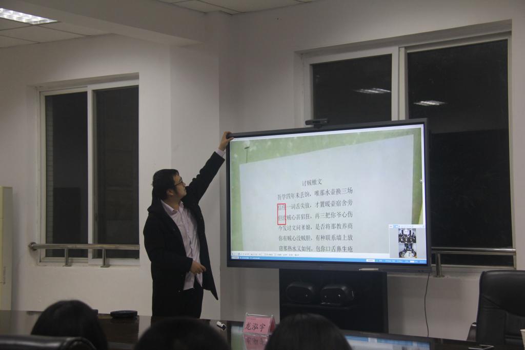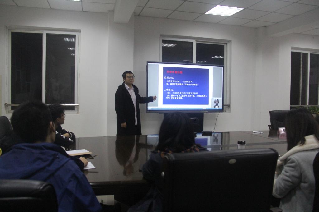 龙泓宇风趣幽默的以《融媒体时代校园新闻的“五罗轻烟掌”》为题,仿佛带领大家通过走进“大片”的方式切入培训主题。他通过新闻稿的六要素展开培训,并通过“火舞艳阳标题要亮;花火似轻烟 结构大过天;排空渡月 美照自来;天极碎星 文风灿烂;振天降魔拳 须是真情感”生动形象地点名标题、结构、配图、文风、真情感的重要性。