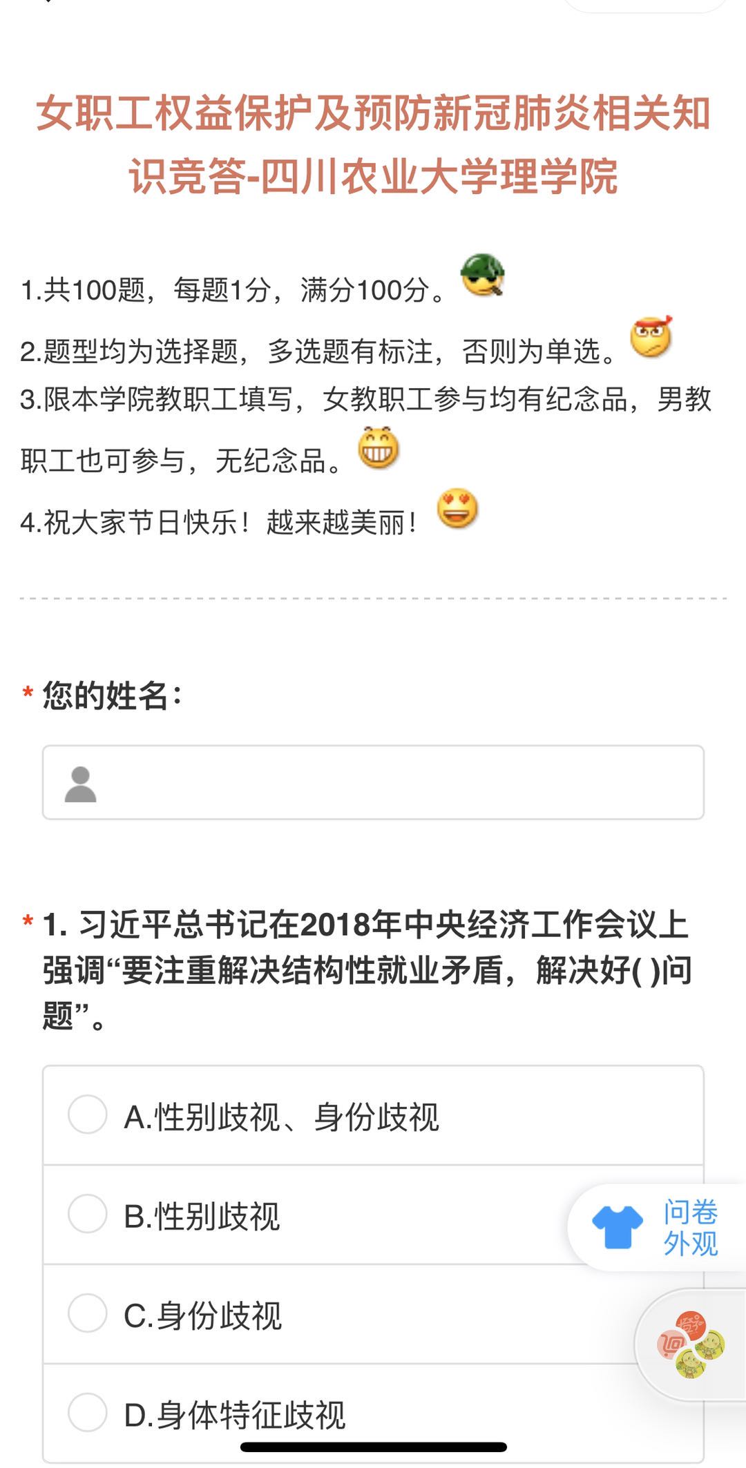 活动以网络答题形式进行,总分一百分,均为选择题。题目分为女职工权益保护及预防新冠肺炎相关知识竞答两个部分。