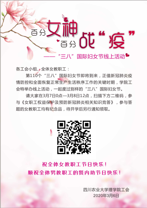 在第110个“三八”国际妇女节来临之际,理学院工会推出“百分女神,百分战‘疫’”“三八”国际妇女节线上活动。