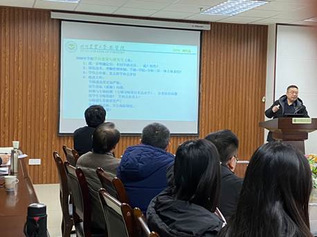 刘应高做了年度工作总结报告。他讲到2019年,学院坚持以习近平新时代中国特色社会主义思想为指导,深入学习贯彻党的十九大和十九届四中全会精神。坚决贯彻中央的决策部署,在校党委的坚强领导下,高质量推动“不忘初心、牢记使命”主题教育与学院中心工作紧密融合,以立德树人为根本,以强农兴农为己任,加强内涵建设,服务国家战略需求,各项工作取得了较好的成绩。从学科专业及平台、师资队伍、科学研究、社会服务、人才培养等方面进行了总结回顾和分析。并对2020年工作计划进行了讲解,并对学院年终分配办法及财务情况进行了说明。