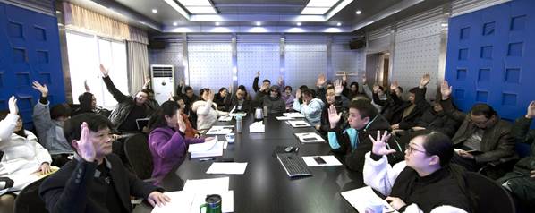 黄晓俐逐项对新修订的《院基金管理使用办法》、《教职工年终奖分配办法》、《教职工目标考核奖励办法》等5个涉及职工切身利益的文件作说明。提请全院教职工审议,大家以举手表决形式逐项通过了5个文件。