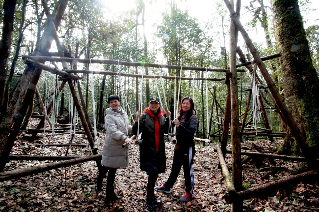 随着向森林深处深入,高大而茂密的树木逐渐增多,踩着由木头铺成的小路,不时看见一个个造型独特的树屋,画着可爱动物的指路牌,老师们的心情一路轻松愉快起来,旅途的疲惫一扫而空。休闲体育系副主任余明荣老师介绍到,这是我院共建实习基地雅安探途全域研学文化旅游发展有限公司依托荥经当地自然资源打造了多个自然教育体验项目之一—熊猫森林国际探索学校。国际探索学校位于大熊猫野化放归基地下方,由树语屋、好奇剧场、森林造物坊等组成,包含了景观体验,项目体验,活动剧场等多个活动项目。