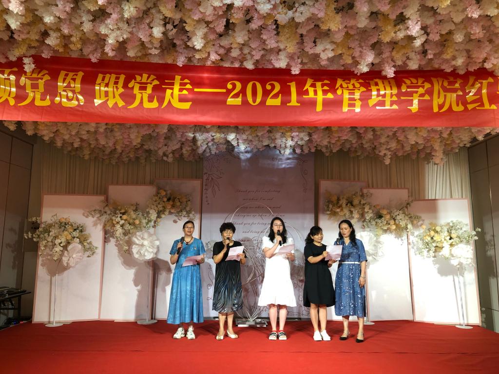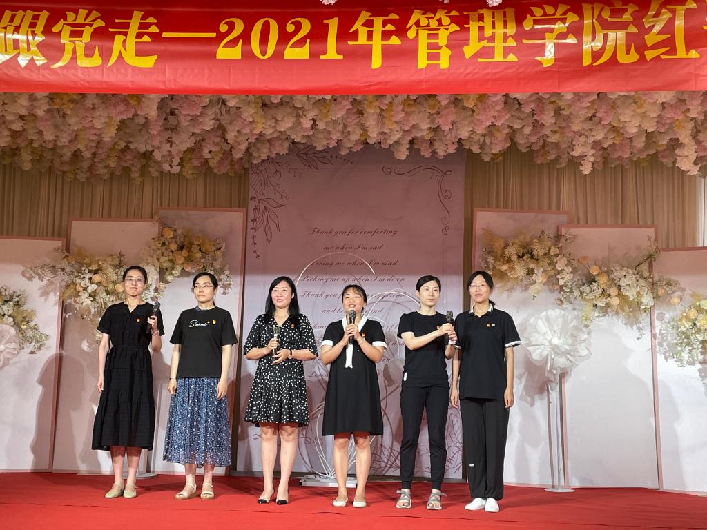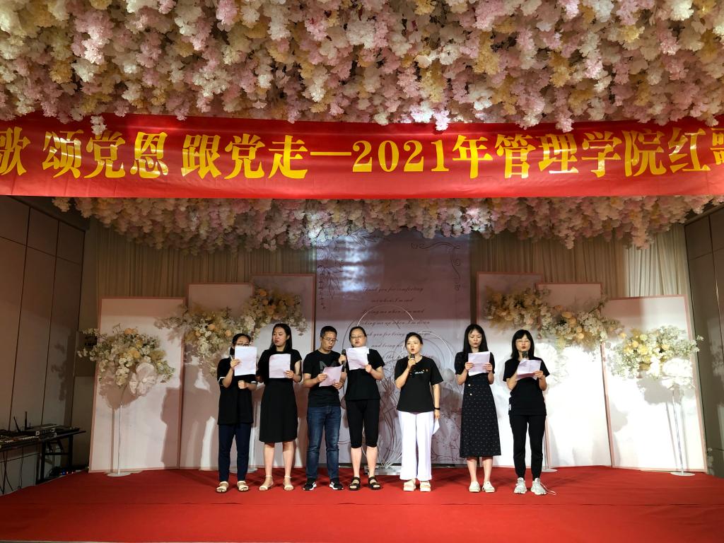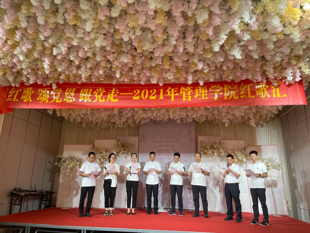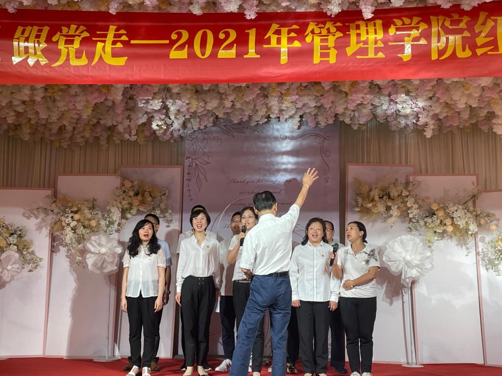 为庆祝中国共产党成立100周年,讴歌实现中华民族伟大复兴中国梦的的奋斗历程,6月29日,管理学院工会举办了“唱红歌、颂党恩、跟党走”红歌汇,学院全体教职工按工会小组合唱和独唱形式参加了比赛。