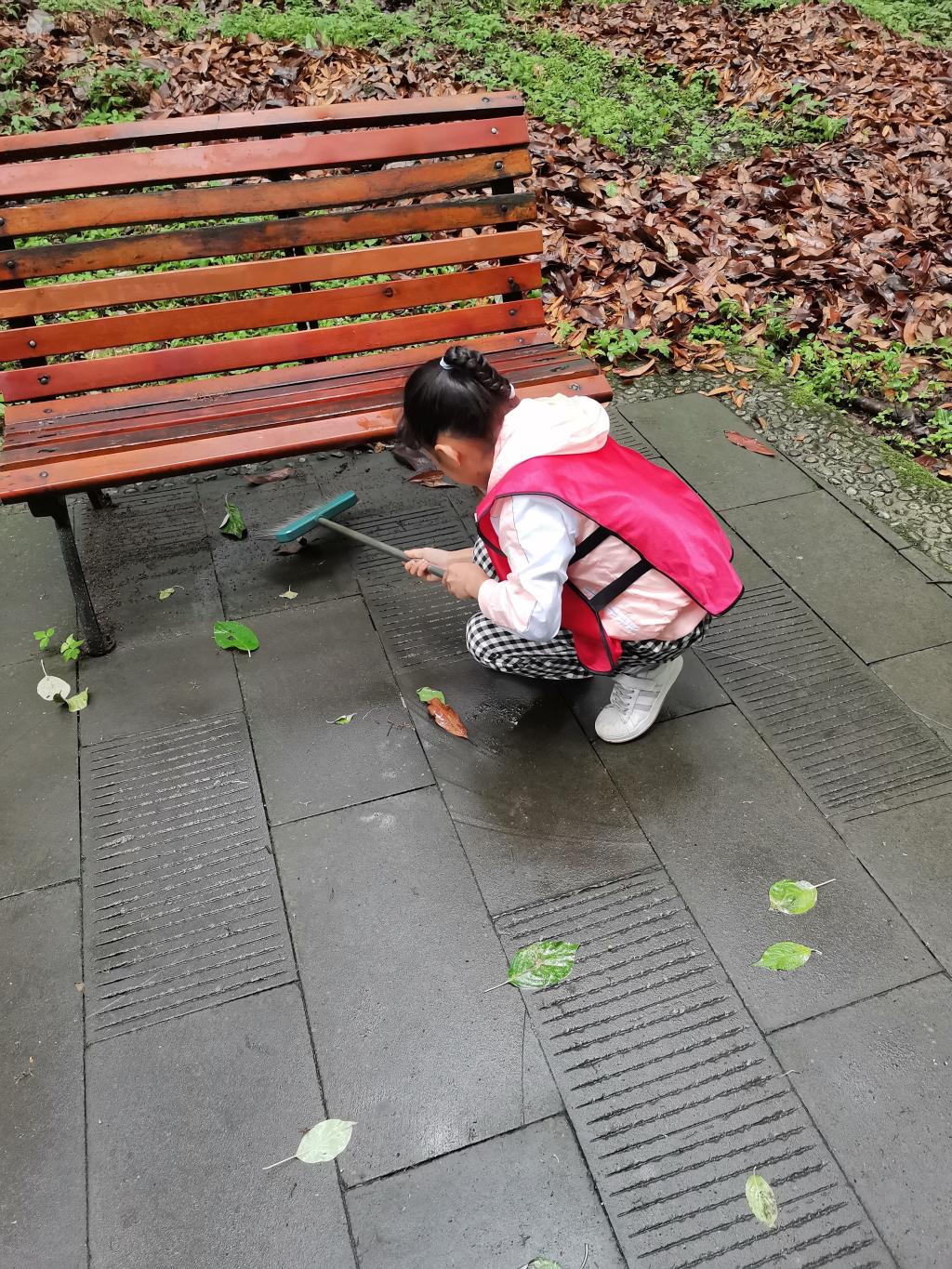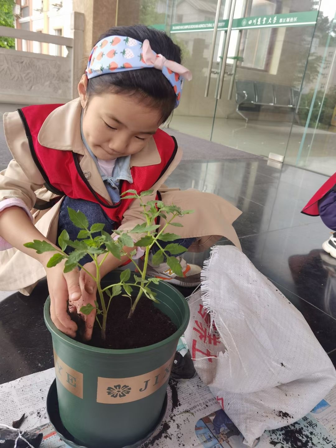 4月30日上午校区机关教职工子女冒着细雨来到读书公园打扫落叶,被雨水打湿后的一片片落叶紧粘地面,给小朋友的打扫增加难度了,他们不停地挥动着手中的扫帚,认真清扫着校园里每一片角落,清除着每一处卫生死角和白色垃圾。打扫结束后,小朋友们每人领到一个花盆、一份营养土和两株西红柿幼苗开始栽种西红柿。小朋友们用剪刀把要栽的西红柿周围的黑塑料皮剪掉,再把营养土捧进花盆,然后把西红柿小心翼翼地放到花盆里,之后把西红柿周围的土培好,轻轻按实!