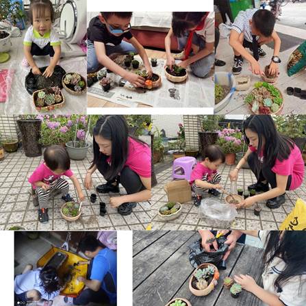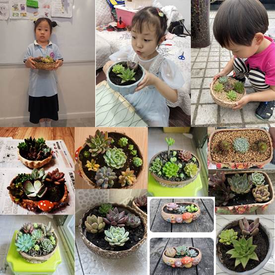 活动中,中心职工和孩子们一起劳动、一起栽培,一起创意,栽培过程乐趣融融。小朋友们对自己的创意栽培作品很满意。