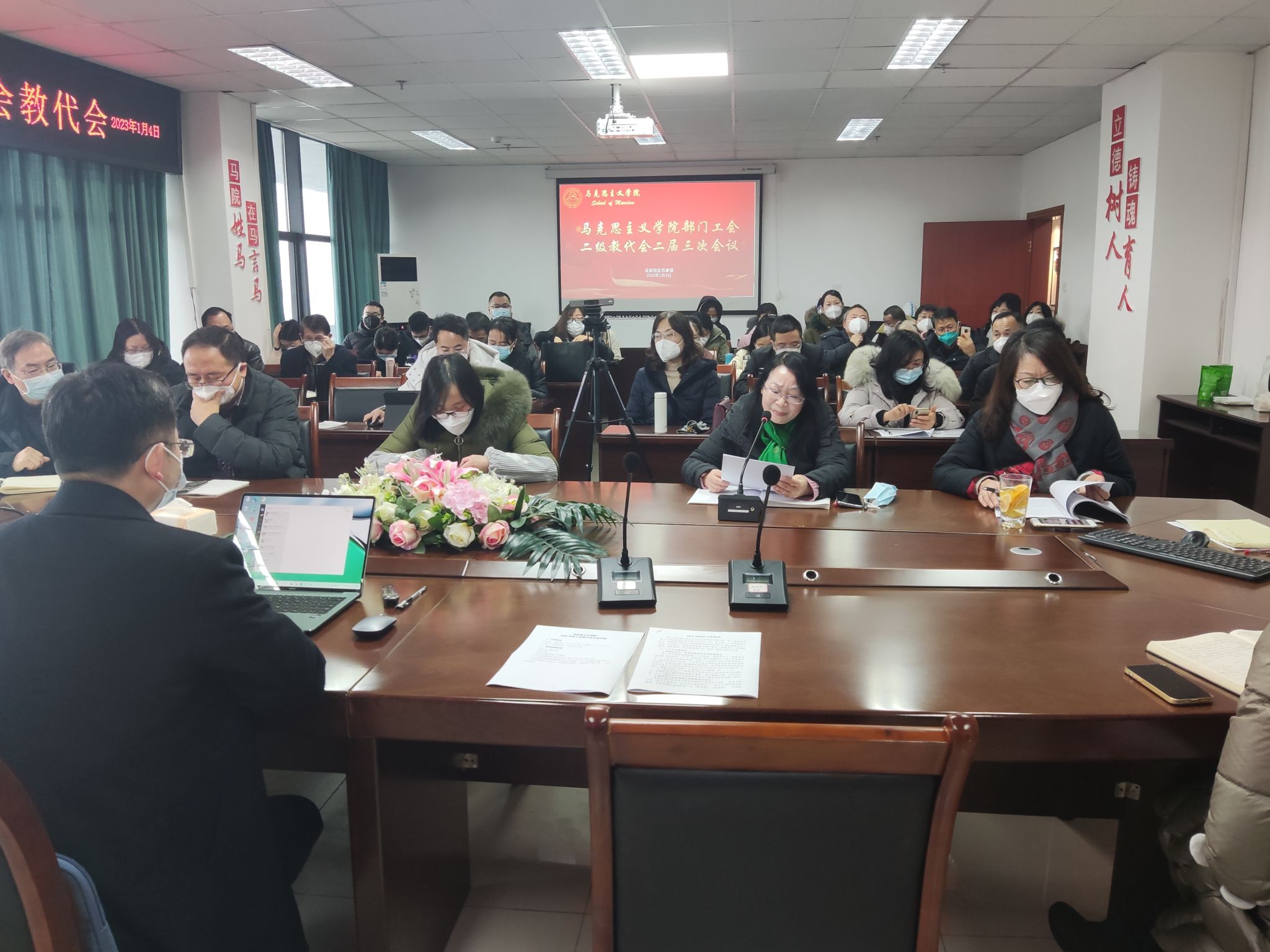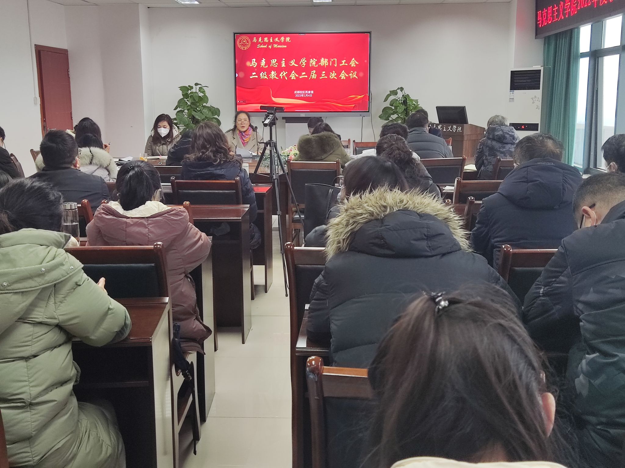 2023年1月4日,马克思主义学院在7-1607会议室举行第二届工会、教代会三次全体会议,全体工会教代会委员和教职工参会。会议由学院党委副书记、纪委书记、工会主席颜怀坤主持。