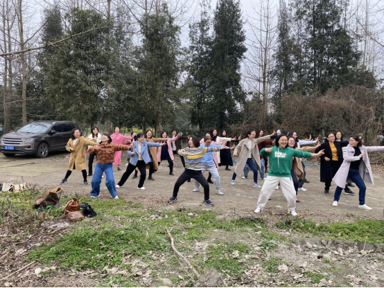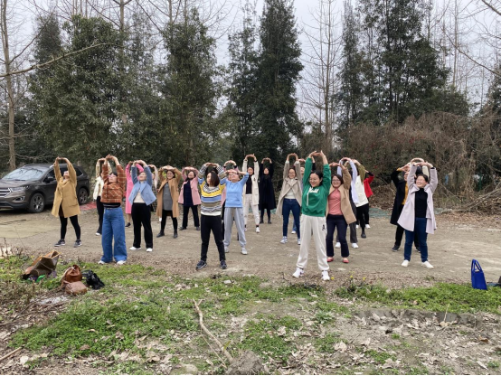 在湛蓝的天空下,全体女教师首先来了一场实力比拼,在领操员的带领下,大家纷纷展示着假期里八段锦的练习成果,你一拳,我一脚,气氛极其热烈。随后,老师们沿着鲁家滩散步、骑行、赏花、合影、嬉笑,在欣赏美景同时,感受春天的万物复苏,美丽的乡村建设。