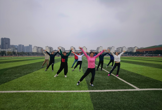 在男同胞的陪同下,成都校区的教职工来到绿茵操场,雅安校区的教职工在明亮宽敞的女子健身房,随着欢快的背景音乐响起,两校区老师们分别在领操教师冯素琼和赵亚茹、王燕的带领下开始了一场酣畅淋漓、活力悦动的团体健身操舞,女老师们个个风姿绰约,充分展示出女性的柔韧和灵活。