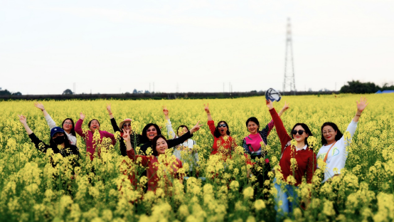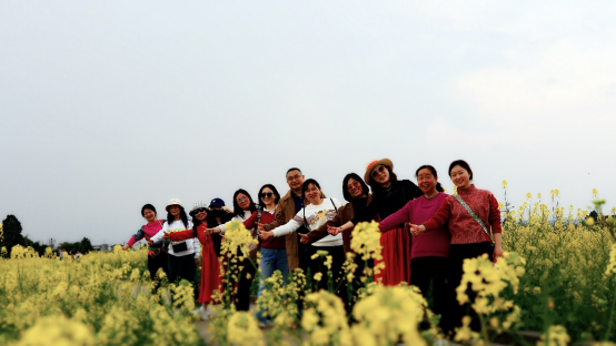 蓝天碧云、花海春色。崇州白头镇五星村外,连片的油菜花汇聚绽放,与村舍相映成趣,勾勒出独属于春日的色彩,为节日的出游、聚会营造出最适宜的氛围。在这里,可以畅游花海,共浴阳光,同享自然风光与乡村振兴的景色与成果,对望平日里紧张激烈工作与花海的宁静安详,恰是这春风奏响的温柔曲,抚平了内心的焦躁与不安。一路上,老师们欢声笑语,有些是为见到久别的工作搭档而兴奋不已的,有些是终于将熟悉的声音陌生的面孔对上号的,有些是加深了平时里很少联系的老师的印象,零距离交流,让大家感受着温暖,传递着幸福。大家或驻足赏花,或为抓拍到高铁列车呼啸而过而喜形于色,或为这眼前的春意而沉醉。