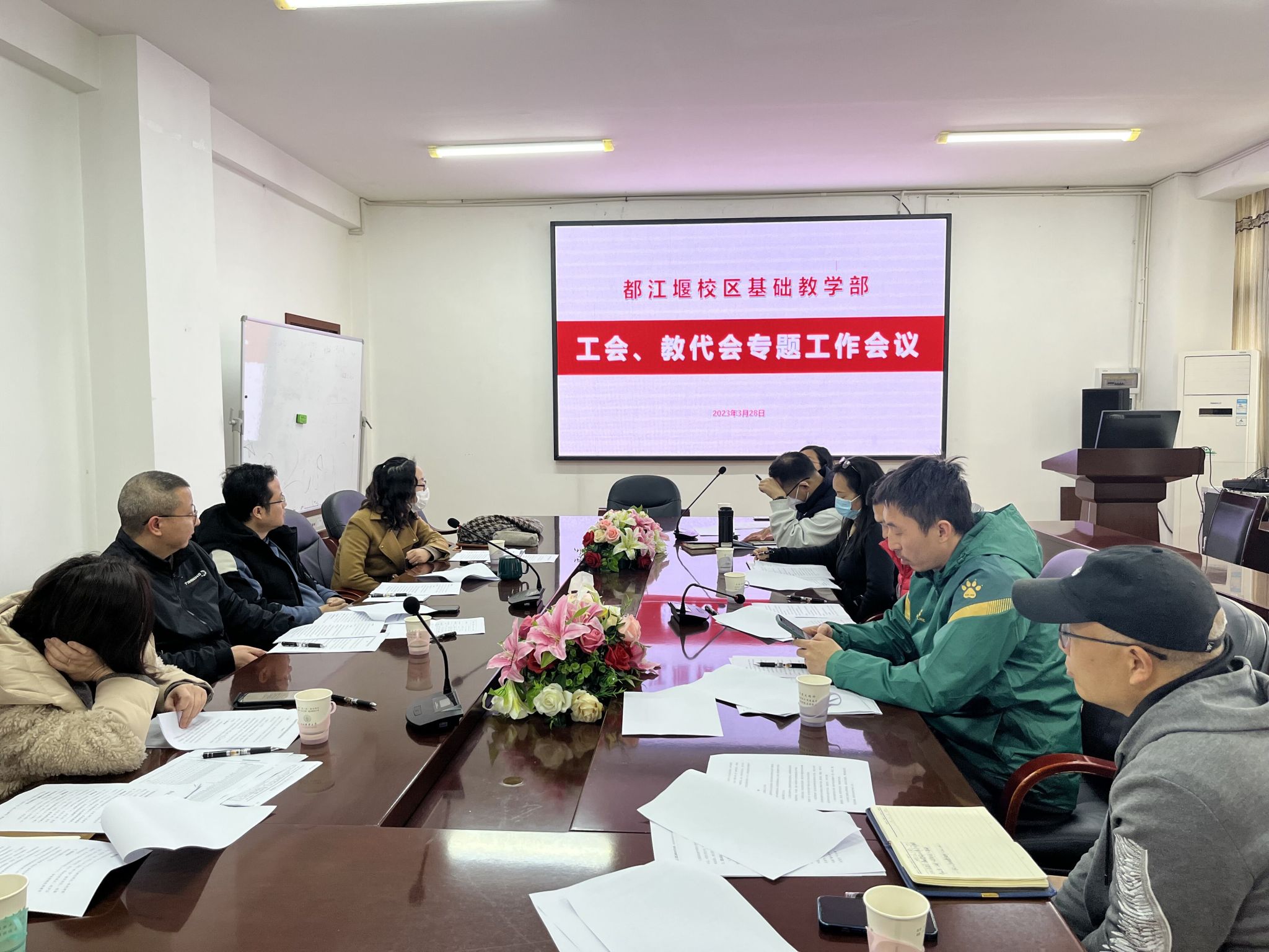 2023年3月28日下午,基础教学部召开工会、教代会委员第2次专题工作会议在4202室举行,会议由基础教学部主任、部门工会主席刘诚主持,教代会主席杨珩等10名老师参加了会议。