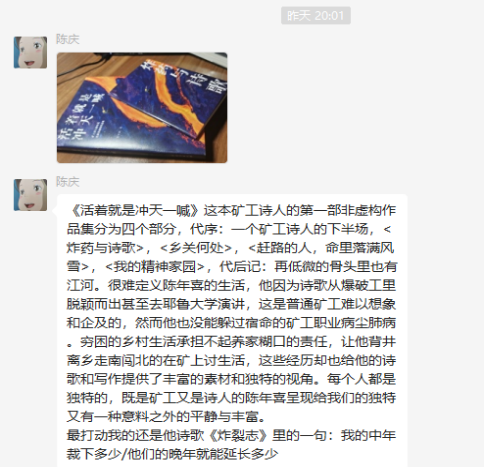 读书活动持续开展一个月,各小组每周汇总参与老师们的读后感、书目推荐、阅读拍照等图文资料,通过QQ群、朋友圈进行分享互动,进一步激发广大教职工读书兴趣,营造浓厚的读书氛围,促进共同成长。