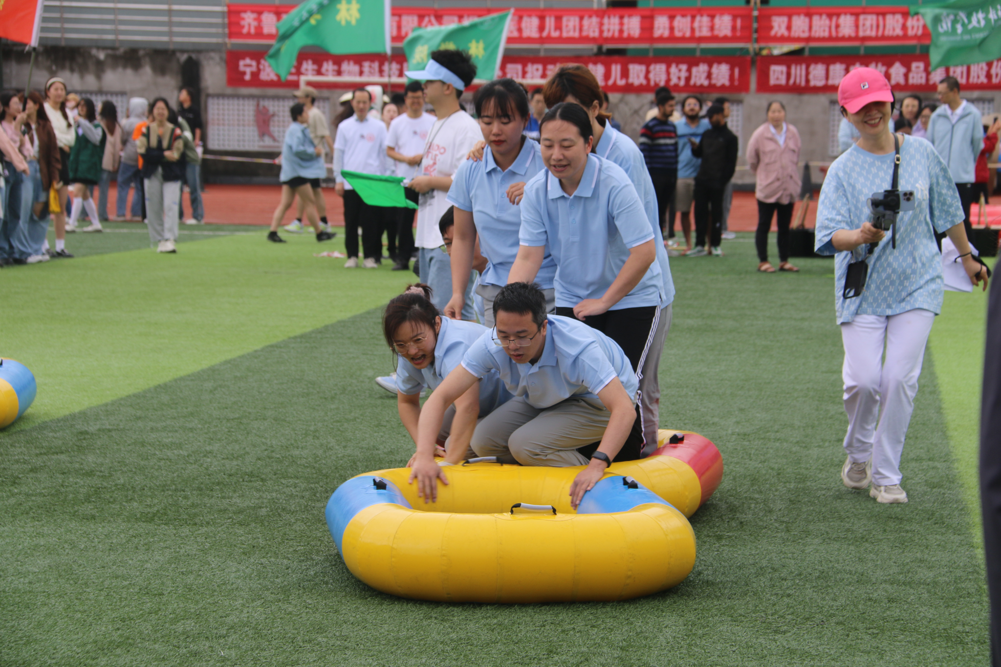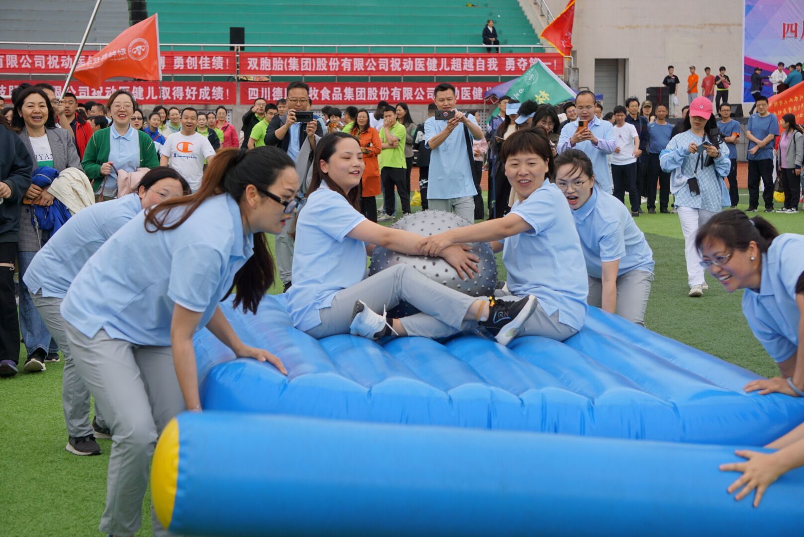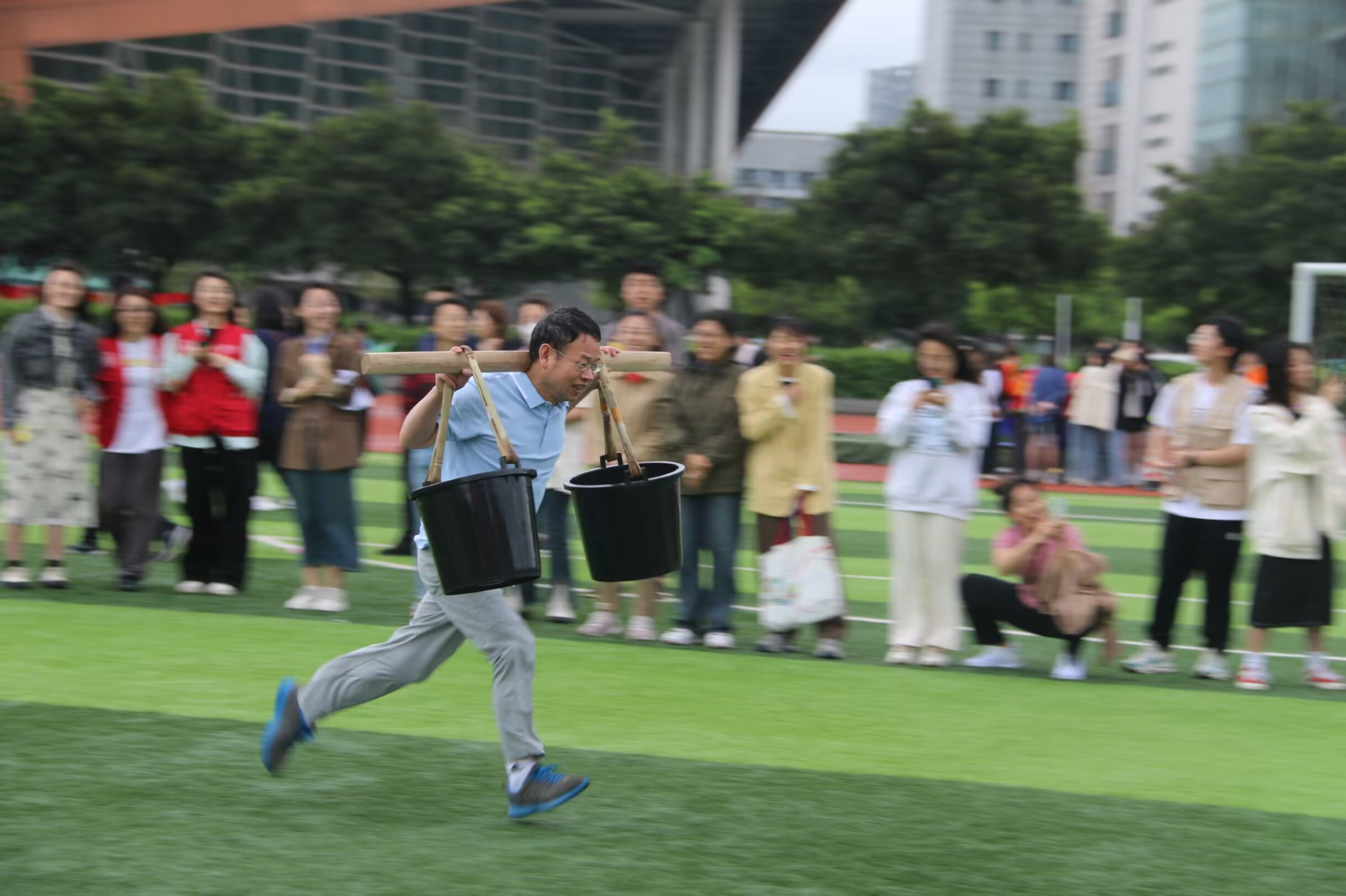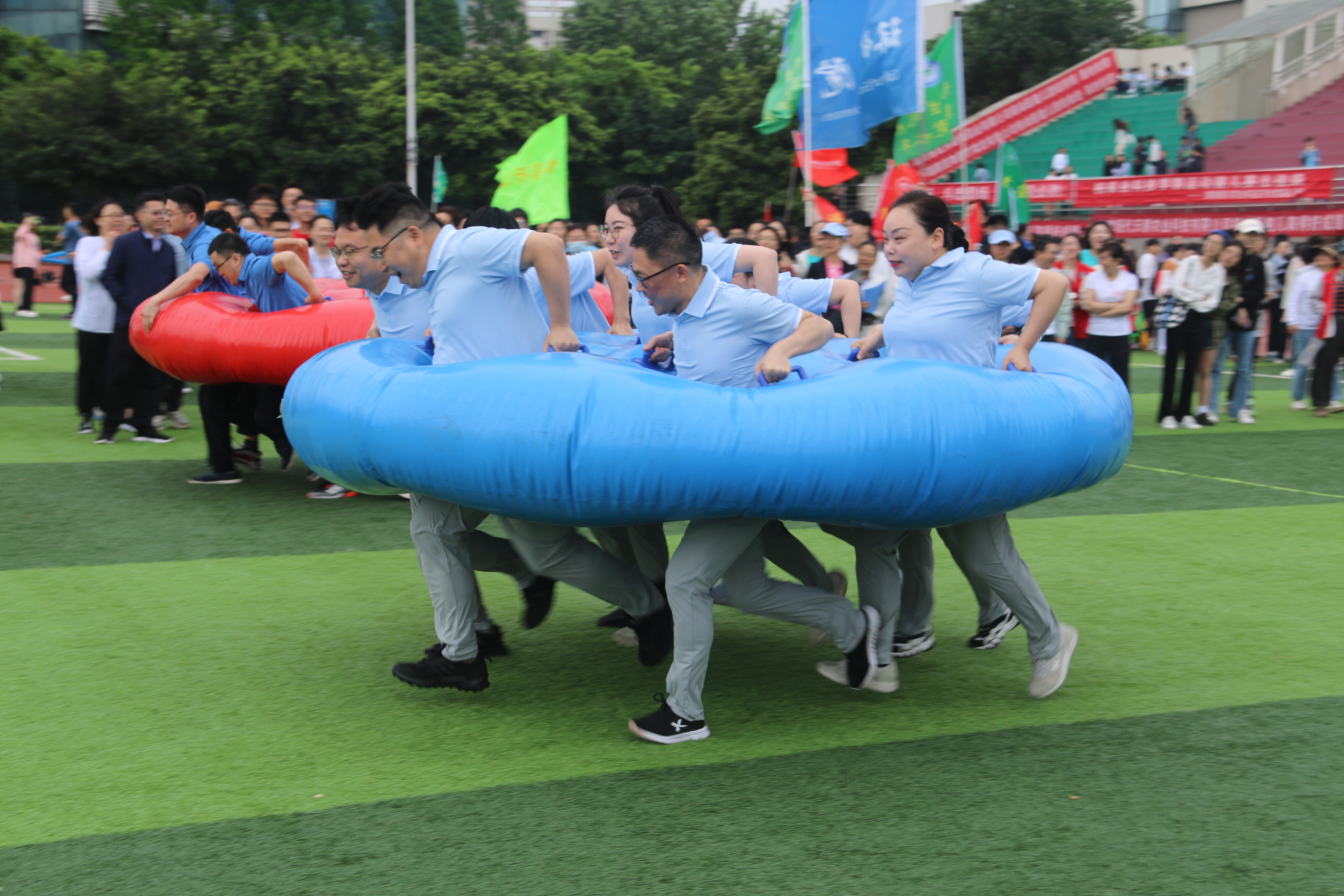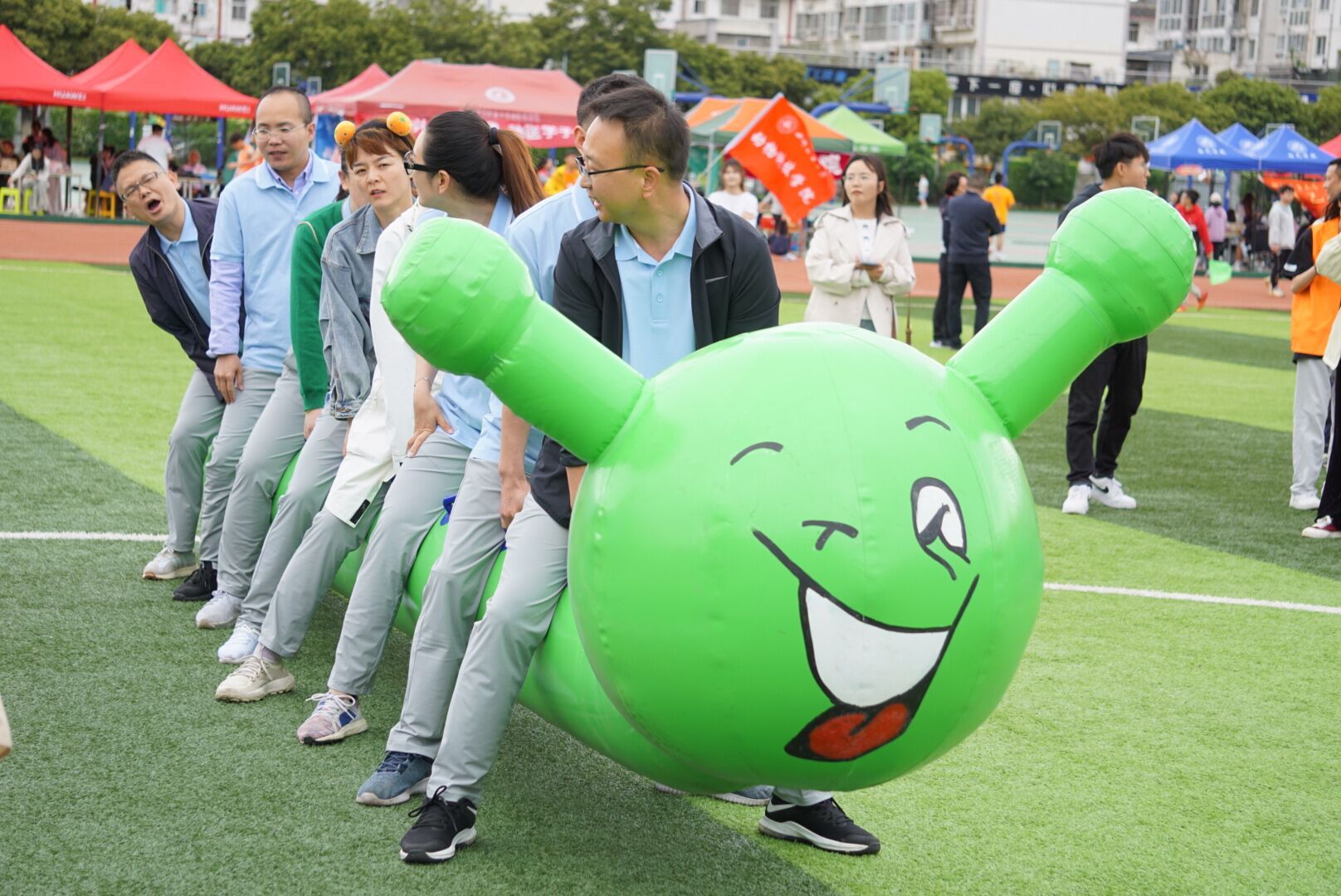 第一个项目“八仙过海”在操场中央火热开展。哨声一响,团队就瞄准终点全力冲刺。紧接着的“无敌旋风跑”中,参赛老师们高喊“一、二、三”统一迈步,默契地跨越障碍到达了终点。整齐划一的队形与步伐,引得观众们频频喝彩鼓掌。“挑桶接力”则是速度与配合的较量,团队成员毫不懈怠、高度认真,在保持自身平衡性的同时,提高接力速度。场上观众更是热情高涨,为老师们呐喊助威。在“陆地飞船”项目中,大家彼此配合,相互鼓励。“修仙铺路”比赛前,老师们就展开了激烈的战术讨论,经过多次尝试后,终于找到了最有效的“铺路”方式。最后一项“毛毛虫竞速”更加考验团队凝聚力,老师们通过多次训练,反复调整步调,逐渐找到了比赛的节奏与最佳状态。