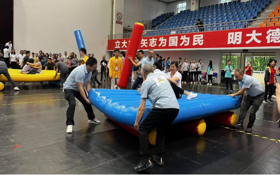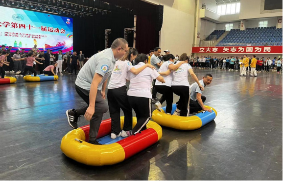本次运动会共有六个比赛项目:无敌旋风跑、挑桶接力、修桥铺路、陆地飞船、八仙过海、毛毛虫竞速,这些项目不只是体能和毅力的角逐,更是团结与协作的比拼。后勤服务总公司两校区共组织近60名员工,分校区分别组成六支队伍参加比赛。成都校区运动场、雅安校区体育馆,洋溢着激情四射的运动热情。随着裁判一声“预备、跑!”后勤职工们个个活力四射、激情高昂,像离弦的箭一样,全力以赴冲向终点……