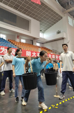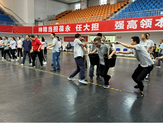 挑桶接力是学校的传统趣味项目,参与的职工充分发挥跑得快、挑得稳、团结协作的精神,仅次于体育学院,获得团体第二名的好成绩。