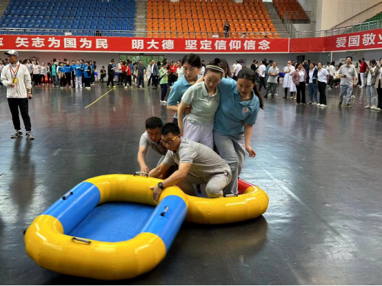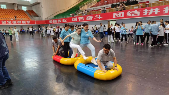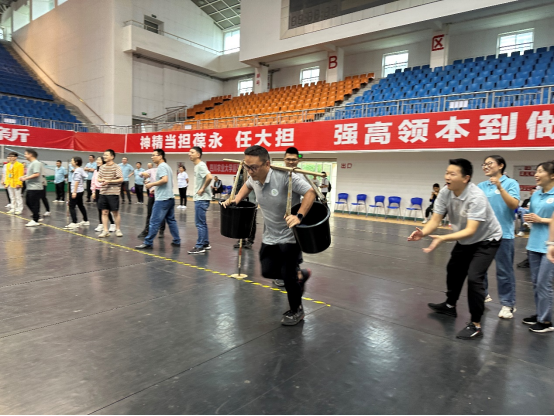 接下来的陆地飞船、修桥铺路更是考验职工的团队协作和集体智慧。瞧,大家齐心协力,步调一致,共同向终点进军!