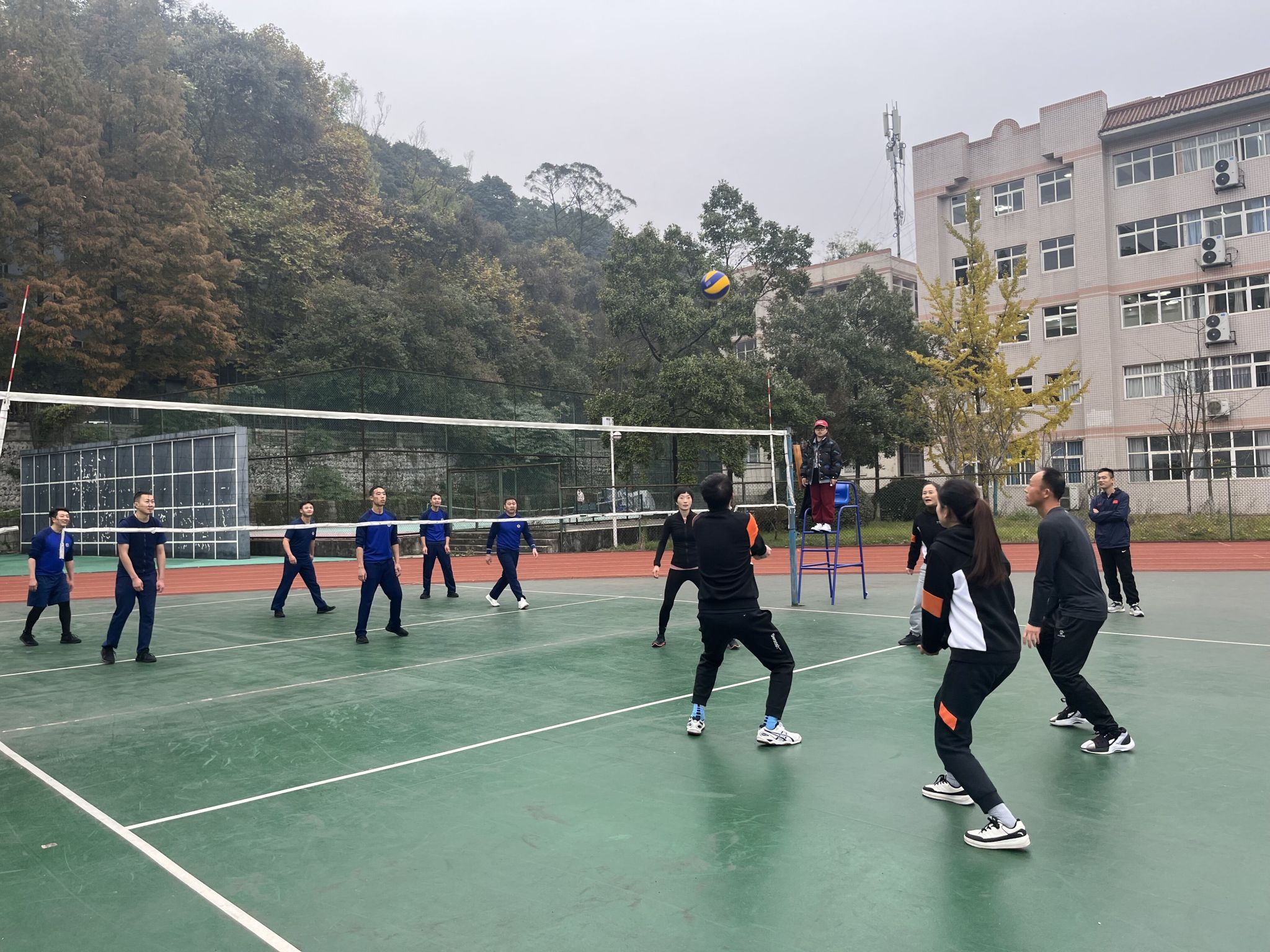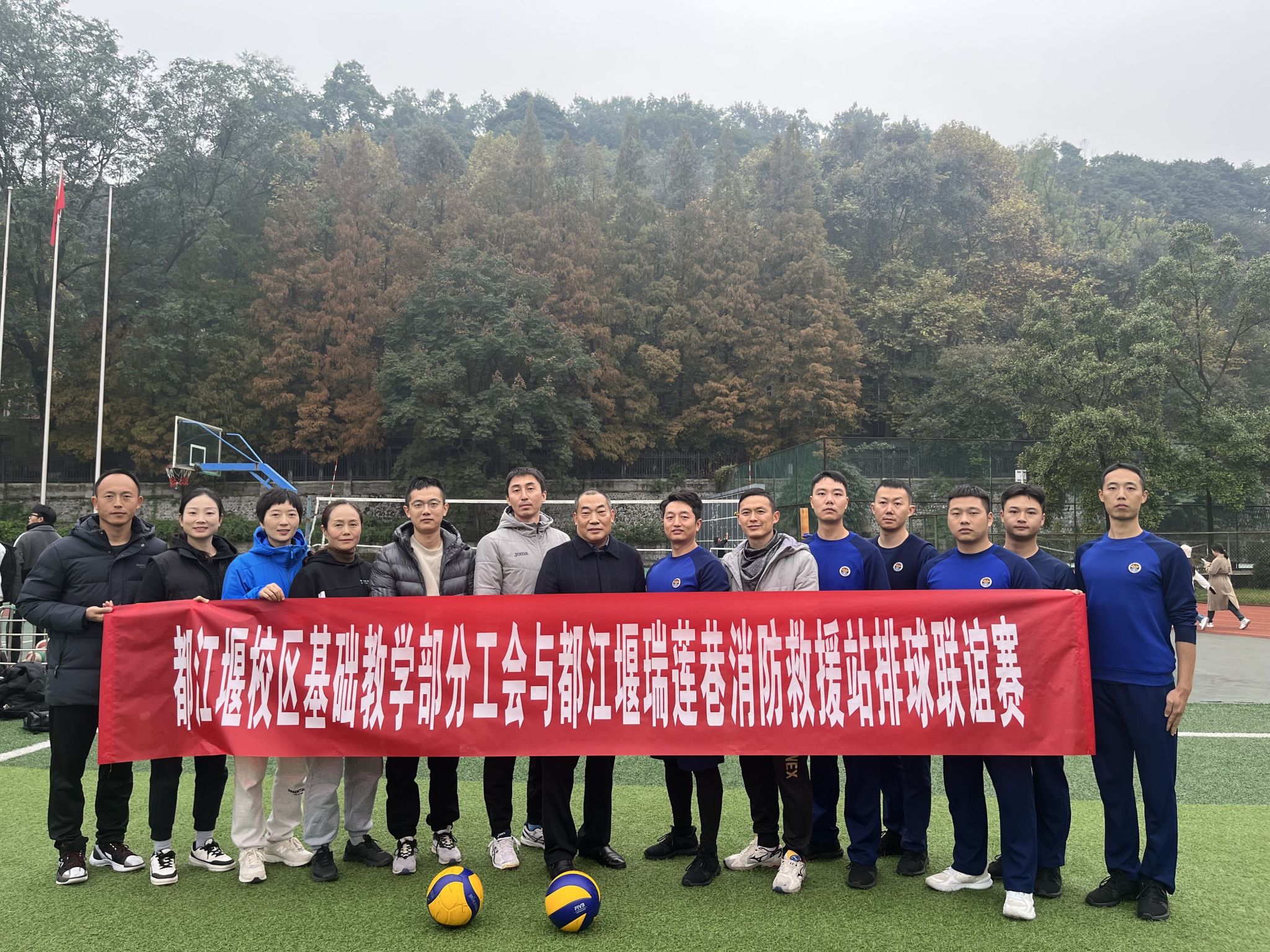 为响应“全民健身”,增强教职工体魄,促进对外交流。2023年11月21日下午,基础教学部分工会和都江堰瑞莲巷消防救援站在校区开展了一场激烈的排球比赛。